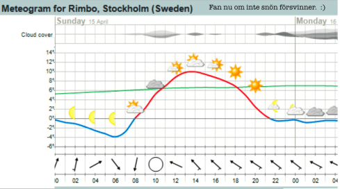 Yr.no spår morgondagens väder. Vi får hoppas de har rätt.