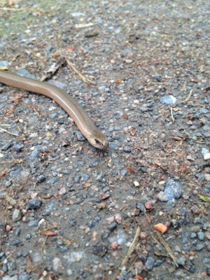 En fin kopparsnok/ödla låg och jäste på grannens infart.