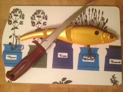 En helt fantastisk dag på sjön, så skoj att fiska med egna beten. Det vi lärt oss idag är för mig att sprayburksfärg tillsammans med sprayburkslack inte är det bästa, snarare tvärtom. Fick lacksläp direkt på ytbetet, och jerkbaitet skavdes av krokarna nästan direkt. Så torkhjul blir det så man kan epoxylacka betena inom en snar framtid, eller med LV1-lack som inte absolut behöver torkhjul.