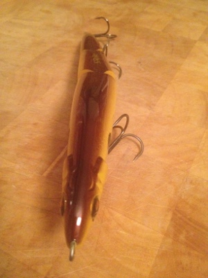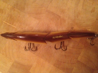 Idag fiskade vi till 90% med egna beten. Johan hade tillverkat precis vad vi kom överens om, ett skeddrag och ett träbete.