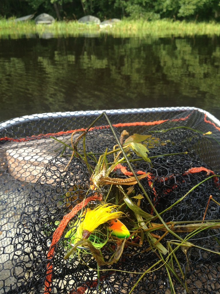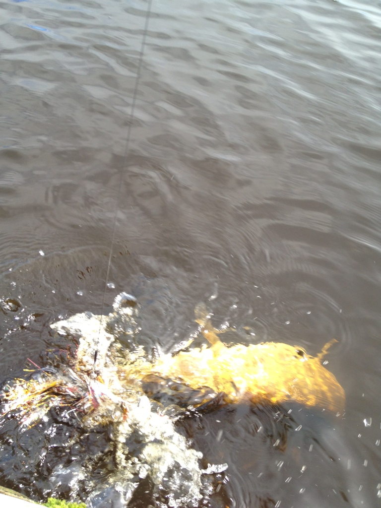 Det kast som kom nu kommer jag aldrig glömma. Jag brassade på med min gäddspinnare rakt över tät växtlighet i en näckrosfamilj. Vevar in som vanligt i rätt lugnt tempo, ser att betet närmar sig en natesskog som jag har på känn kommer göra att mitt bete fastnar och blir fullt med grönska. Jag gör vevstop, fortsätter veva precis till natessamlingen, här tänker jag, skit samma nu vevar jag på. DÅ, SMACK! Gäddmamman kliver på, vi pratar cirka 4meter från båten. Jag känner att det är en större fisk, och när hon bryter ytan ser jag att det inte är en fisk som jag vill tappa. Håven låg ihopfälld i båten och jag eldar på Posa att han får minsann skynda sig på…. det går för sakta. 😀 Ni vet känslan när man har stort på och någon ska hjälpa till. 😀