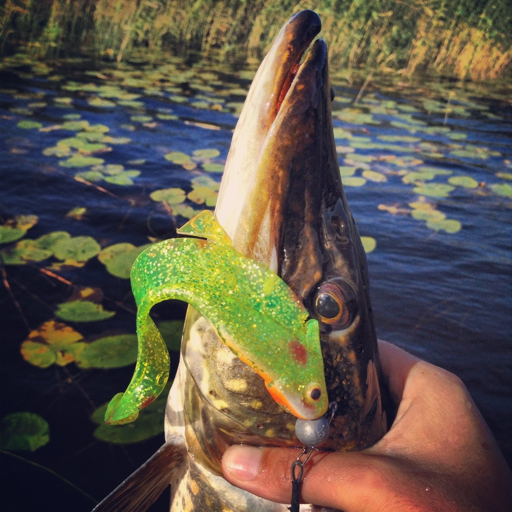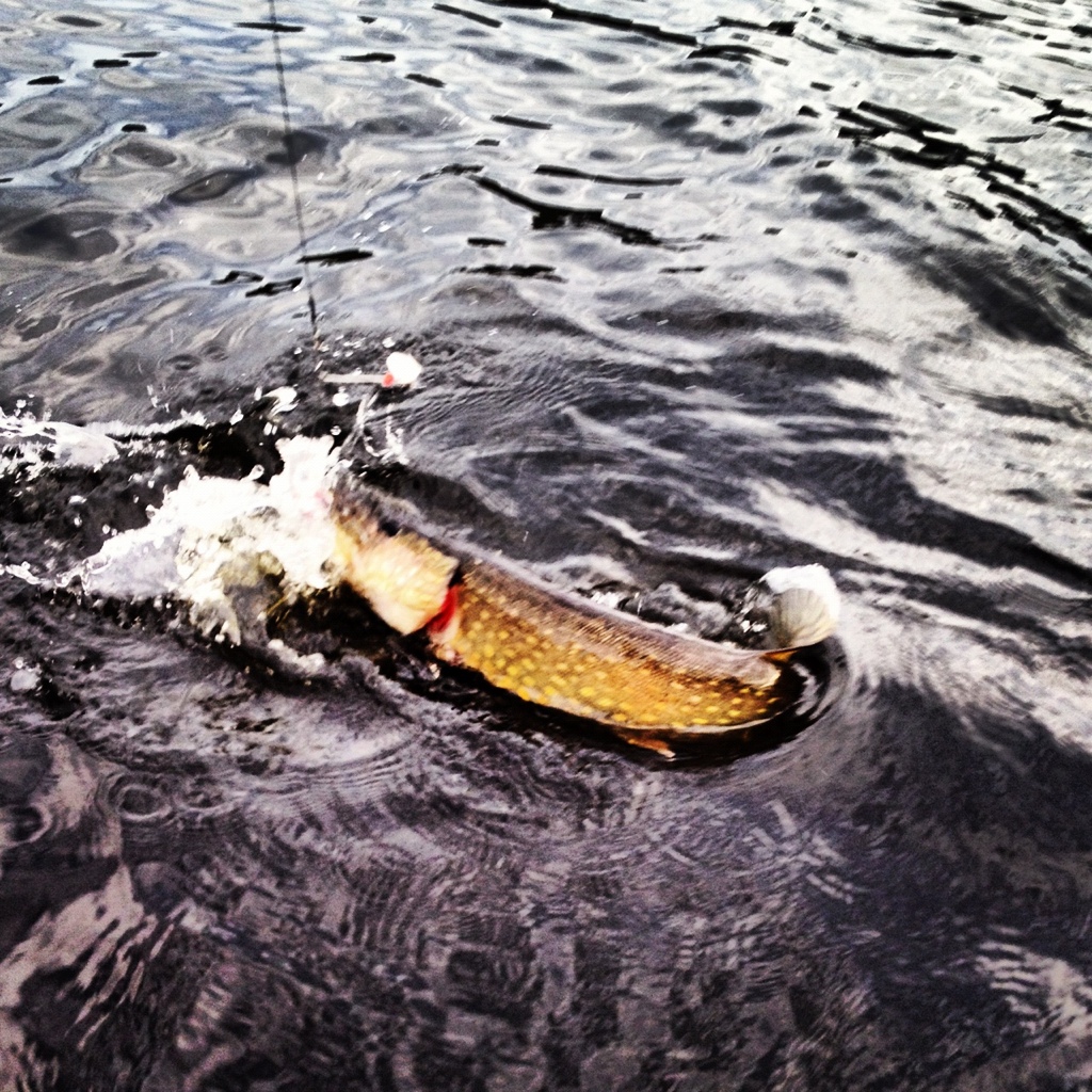 Denna jig heter Mitchell, och färgen var grym dagen till ära. Gick som en jig, och har en underbart rullande gång vid enbart invevning, vilket visade sig vara “dödligt”. Denna bild visar även vad en fet gäddmadame kan göra med en stingerkrok om den verkligen vill. FEETT hugg, 1sek på, borta. Puls på 190 och besviken. 😀