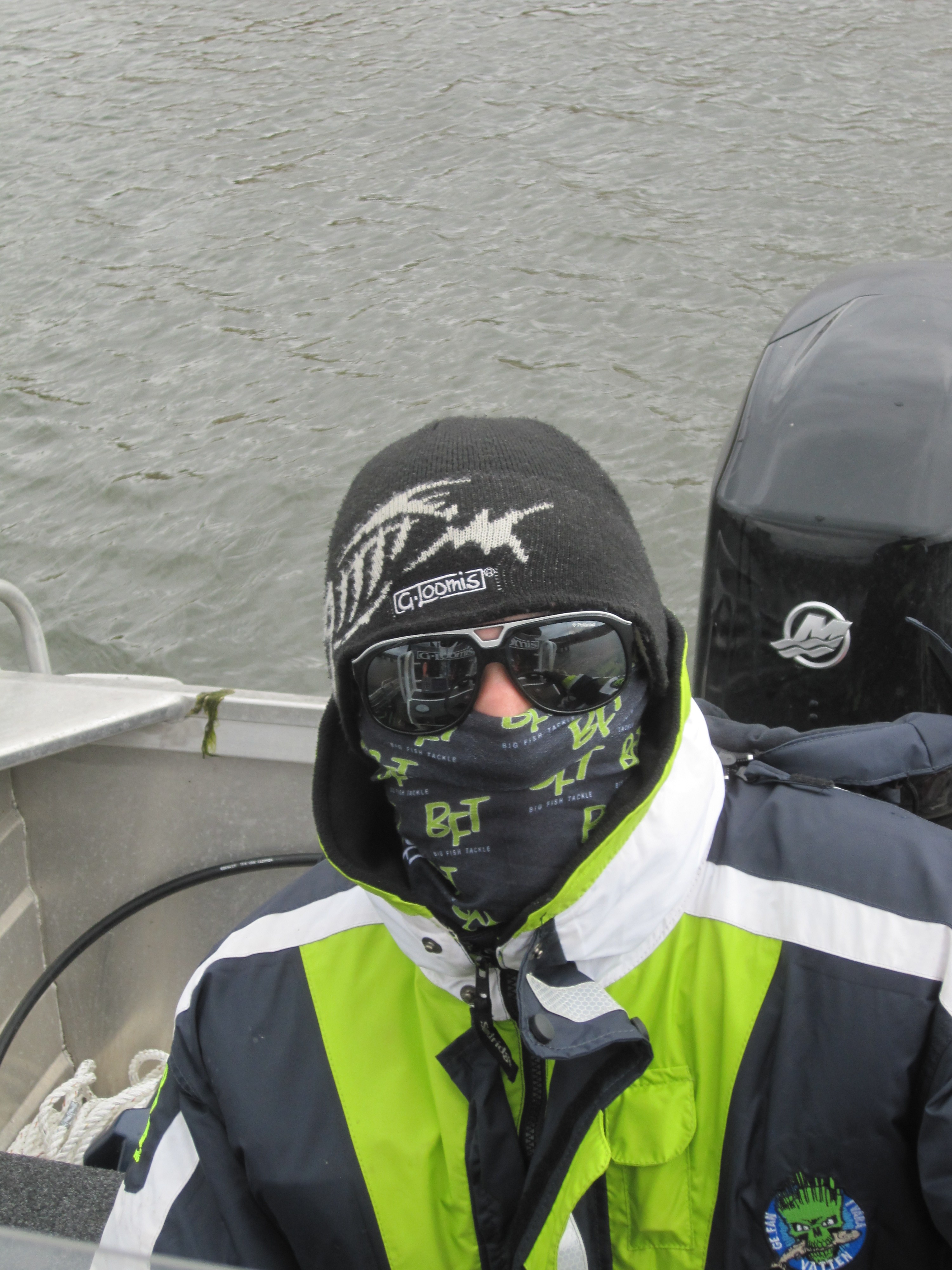 Amber som körde och stog långt bak såg ändå rätt nöjd ut i sin överlevnadsoverall, jag och Micke som satt fram vid kastdäck fick våra rumpor smiskade av de galna jävfla vågornas bankande mot båten. Vatten öste mot oss och jag tänkte de tre första vågorna “det där var den sista vågen”… men när den fjärde vågen äntrade båten fick jag nog och drog på regnkläder. Aningens försent, jag var helt sjöblöt in på bara livet. 😀