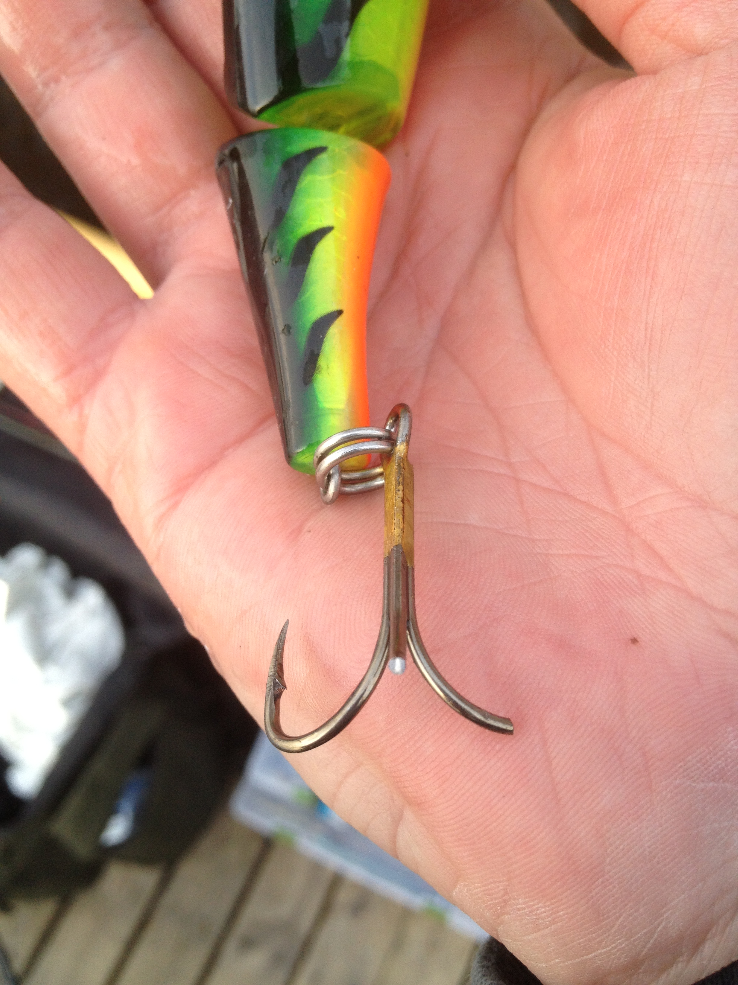 Båda krokarna satt, den ena rätt olustigt. Inte i hals eller så, utan att två trekrokar satt fastvisare i munnen!?