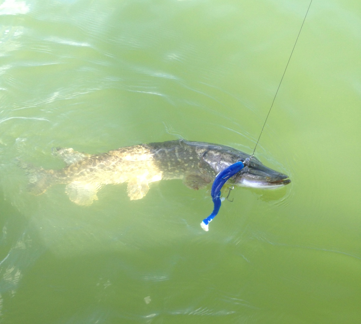 I den gröna vällingen kom även en aningens större gädda upp, iaf om man jämför med dagens första minigädda. Den tog på spinnerbait från BaylakeBaits.