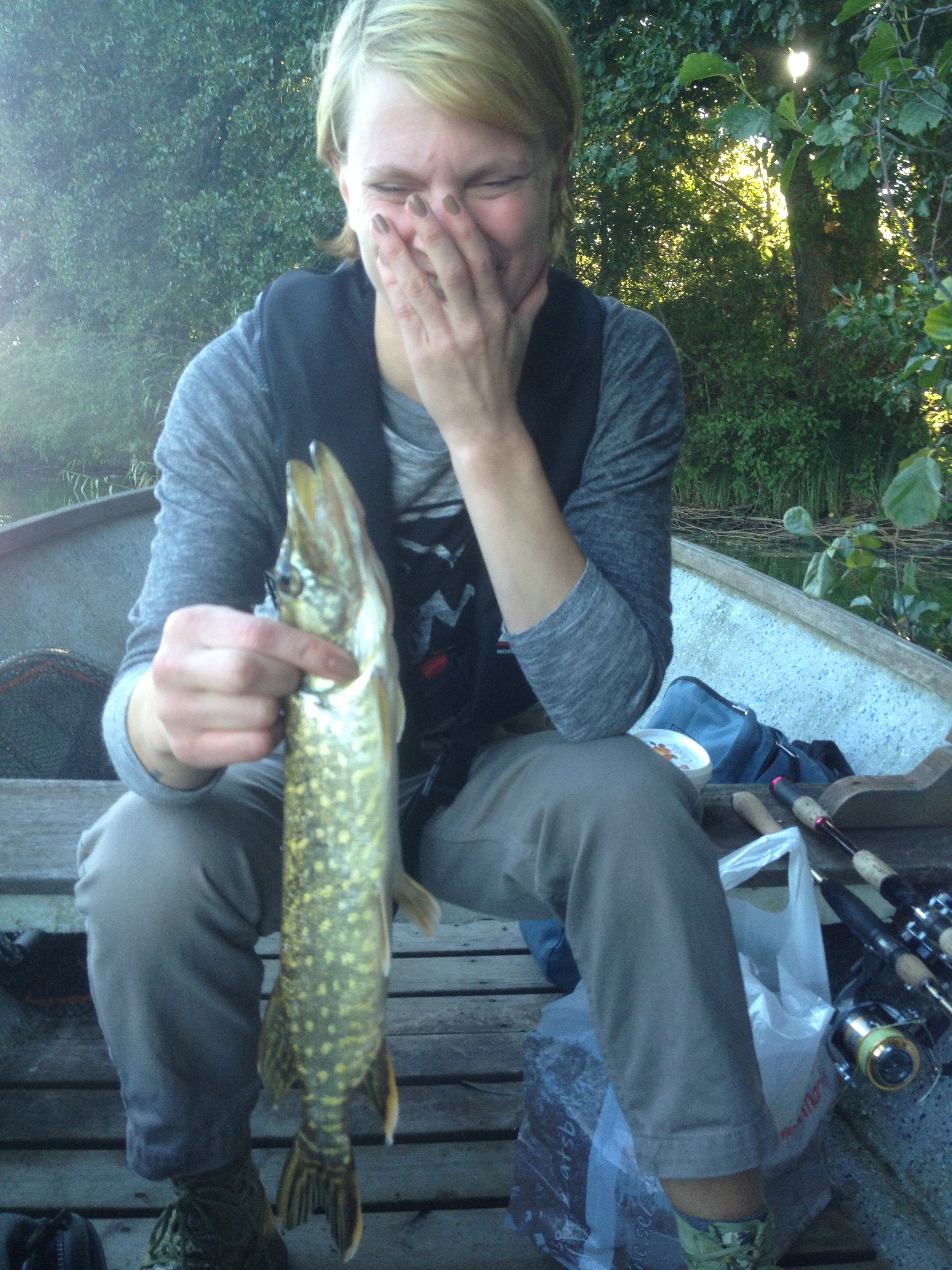 Hantering av sin första gädda. Stort att få vara med och uppleva. C&R. Aningens skräck blandad med förtjusning. 😀