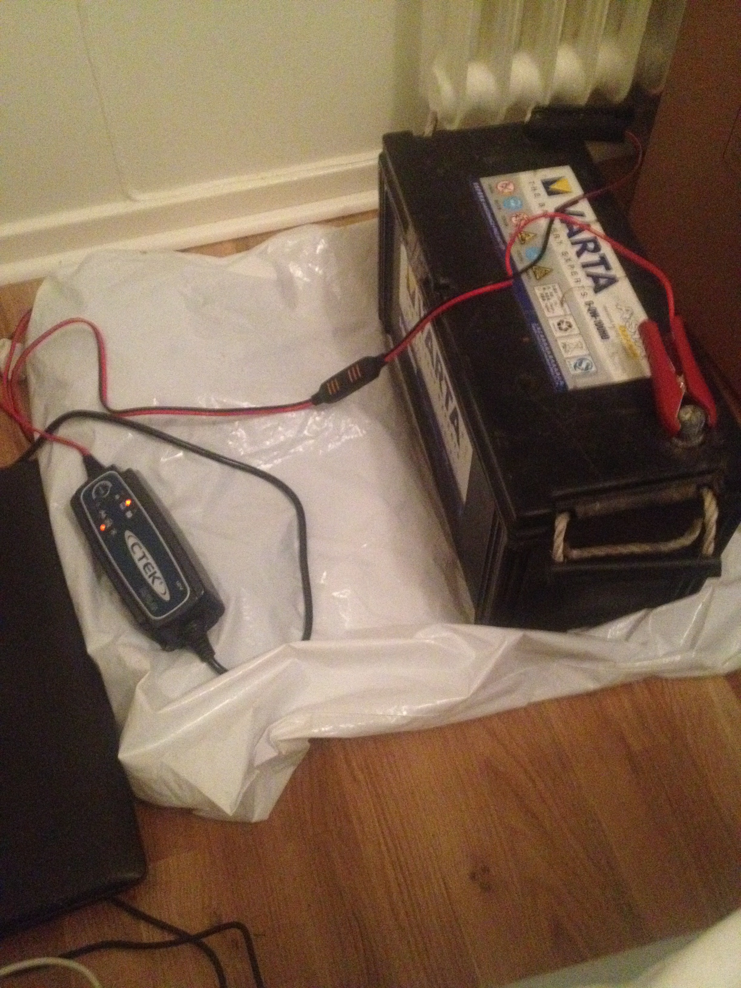 Batteriet hade stått på laddning hela natten, märk väl mitt fina batteriskydd mot ekgolvet. 🙂