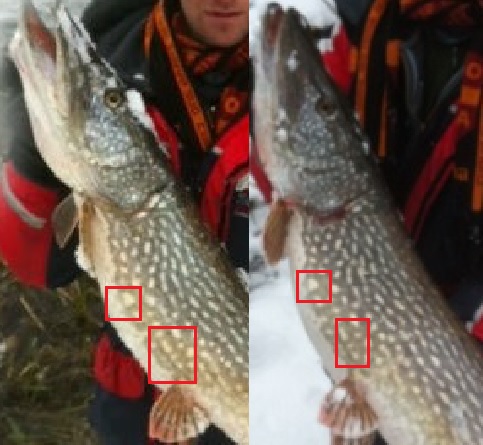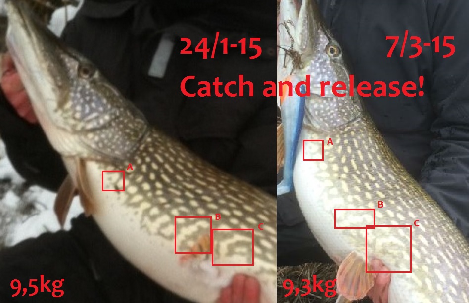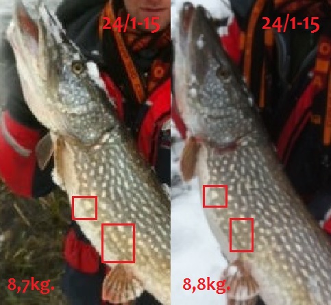 Men nu när jag och CaesarLures fiskat tillsammans 2 pass och fått fyra gäddor med vikterna 8,7 – 8,8 – 9,5 och från nu i helgen då jag drog jag en 9,3:A. Då tänkte jag jämföra de tre första gäddorna med den fångad i lördags. Dra på trissor när min 9,5:a från i januari var samma som den jag knep nu i lördags!!