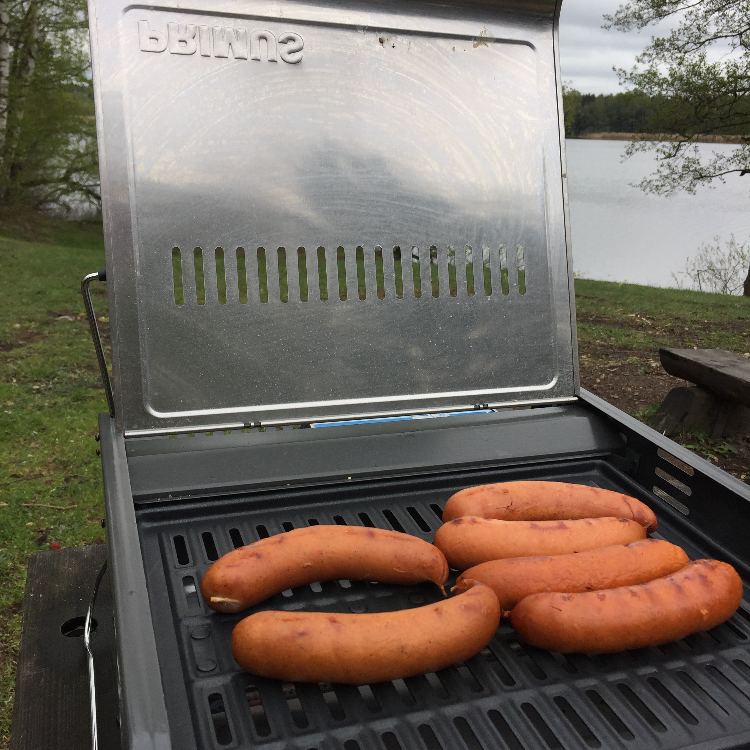 Lunchpause hade vi sen. Rogert har köpt sig en gasolgrill. Avisst, grillkol har många fördelar smakmässigt och grillmässigt. Men på fisketurer, my god vilket fantastiskt verktyg. Varm direkt, grillar bra, väger knappt någonting, lämnar inga sopor och blir kall typ direkt efter grillning. Super!!! 3 sorters korvar, ketchup, 2 sorters senap, rostad lök sen var vi klara för lite mer fiske.