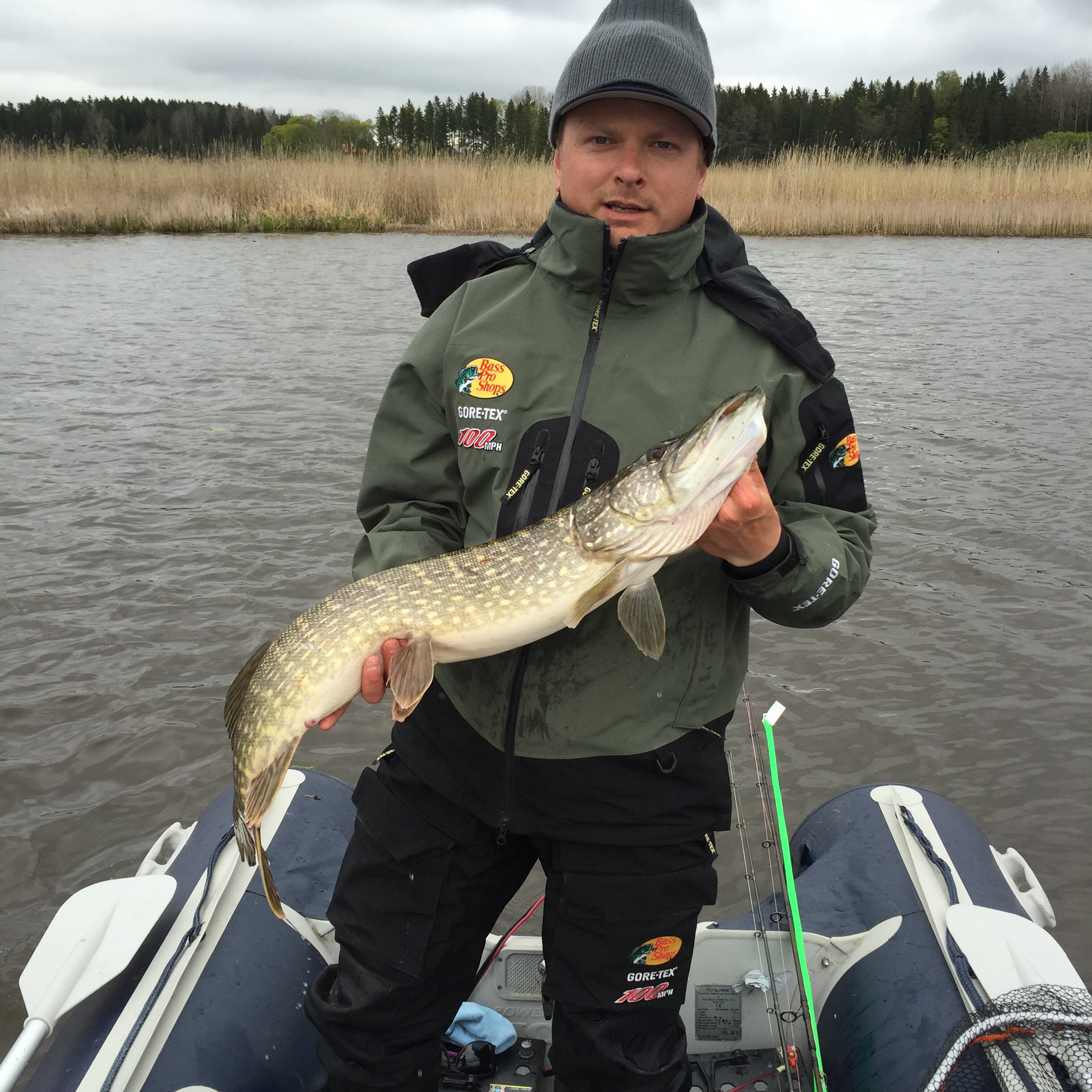 Jag införskaffade mig två spinnerbaits från Rock N Rolle, en av dem i firetigerfärg har som en tail på bakersta av två krokar. Gick förföriskt. Just igår var det premiärtur med dem. Slängde ut lite lina och drog betet in mot båten. Gick kalasfint i vattnet. Ett kast mot vasskanten, vevade in. Kastade igen. Betet hann landa, och jag började nästan direkt veva. Hann göra ett, kanske två vevtag innan *SMACKA* gäddan kliver på. Där vi fiskade var det relativt grunt, vi snackar 50-100centimeter kanske. Så man såg direkt det var bättre fisk, och framförallt kände det i spöt när det tjongade till. Snabb drillning. Blev alldeles glad av spöryck och adrenalinpåslag. Ska väl ärligt skriva att mitt mothugg var kanske inte det bästa i världshistorien, eller jo, jag var med på mothugget. Jag och Roger hade tidigare pratat om bromsar man glömmer spänna, just denna fisk var en sån. Fick vid mothugg inget gensvar, så fick bromsa med tummen, sen hundradelen senare spänna bromsen. Gick bra det med. 😀 Jag kör till en början stenhård broms egentligen, haspel som multi, sen kan jag släppa på bromsen om det behövs. Men mitt fiskesätt tycker om stenhård broms.