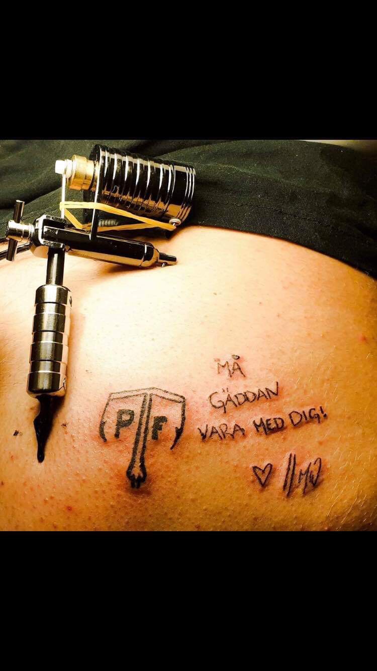 Den kanske galnaste presenten stod Kricke “KH-Lures” Högberg för. Han hade haft en tävling där de tävlande skulle gissa vilken personlighet i fiskevärlden som han tatuerade ngt kring på rumpan. Rätt svar ser ni nedan. Min “signaturfras” och min logga i fri tolkning. Så jäuvfla roligt, konstigt och speciellt. Men nu är vi tre i världen som har TPF-loggan på våra kroppar. ❤