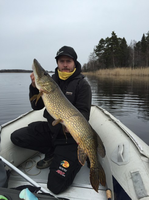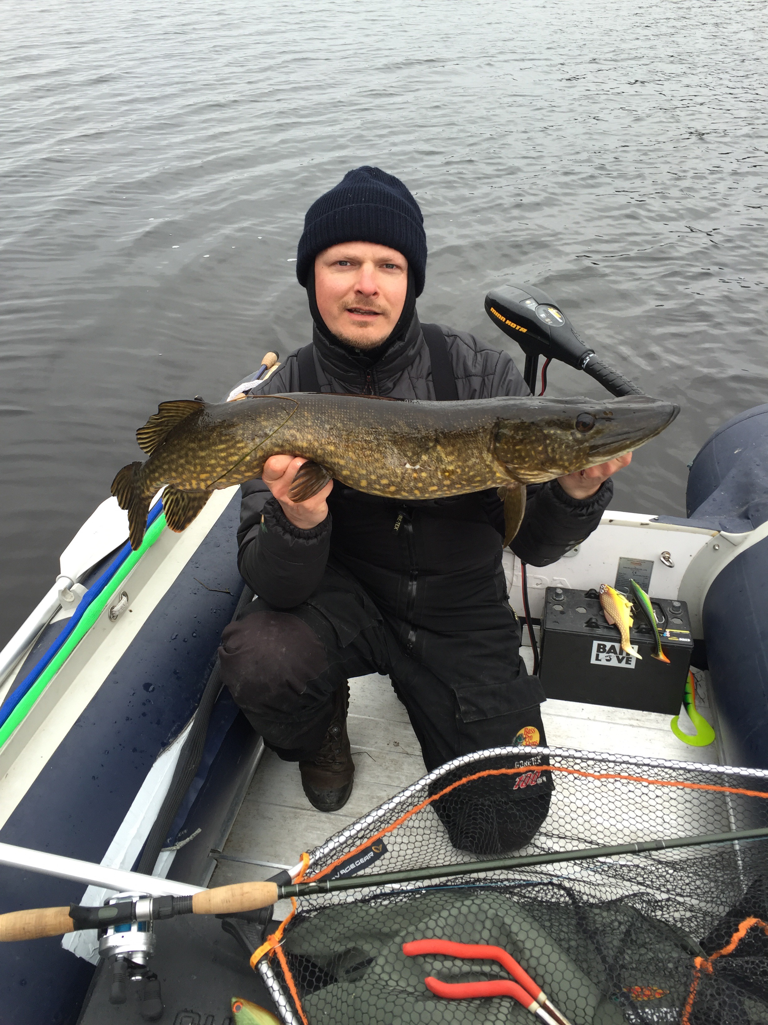 Sen var det min tur för första gäddan från båt för iår. Jag skulle testa mina nya Pankan-beten från BroBaits jag fått några dagar tidigare. I vad jag valde o kalla “Love-edition”, Thomas hade gjort två modeller, en med hjärta på sidan och en med TPF-loggan och ett hjärta på buken. Tror det var om inte första, så andra eller tredje kastet jag gjorde (första var ju mer “hur går betet”-kast) som fisken högg. Helt ärligt, det stack upp lite vass just där jag kastade, jag fastnade i vassen, slet till, sen högg fisken och jag gjorde mothugg. Första sekundrarna trodde jag det var vass, tills vassen kändes i spöt och drog år sidan. Då förstod jag det var en bättre fisk.