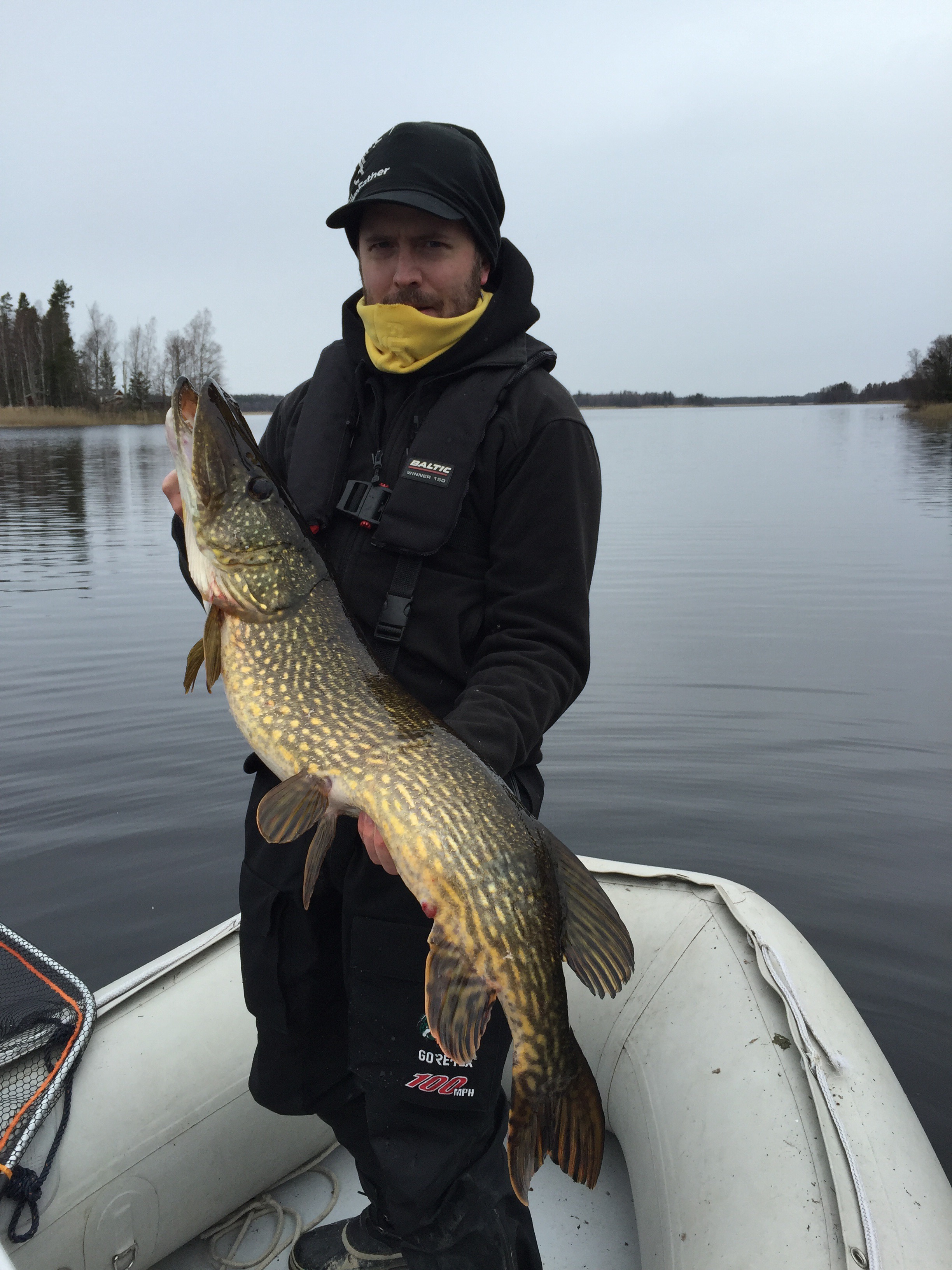 Roger stod beredd med håven och vi fick in vad som visade sig vara en 7,6kg´s gädda som snabbt och problemfritt fick simma hem igen. Underbart!