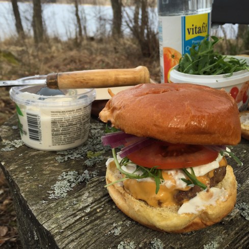 En riktigt seg dag för övrigt, förmiddagen fram till kanske 11 bjöd mig på två gäddor till utöver 7,6:an, varav den ena gjorde ett så jäuvfla arg hugg som jag kommer minnas ett tag. Såg hela händelseförloppet, kom rakt bakifrån efter en ytligt fiskad ErstavikTail och argt, bestämt och pondusfyllt *SMACKA*. Riktigt coolt! Dagen mängdmässigt stod Roger för även om det inte var någon gäddbonanza över huvud taget för någon utav oss. Vi fiskade till lunch sen bjöd Roger på fantastiska hamburgare gjorda på högrev och med tryffelmajo, ruccola, tomat, lök och cheddarost! Underbart gott!
