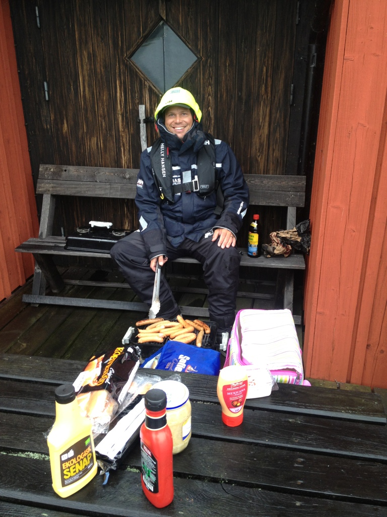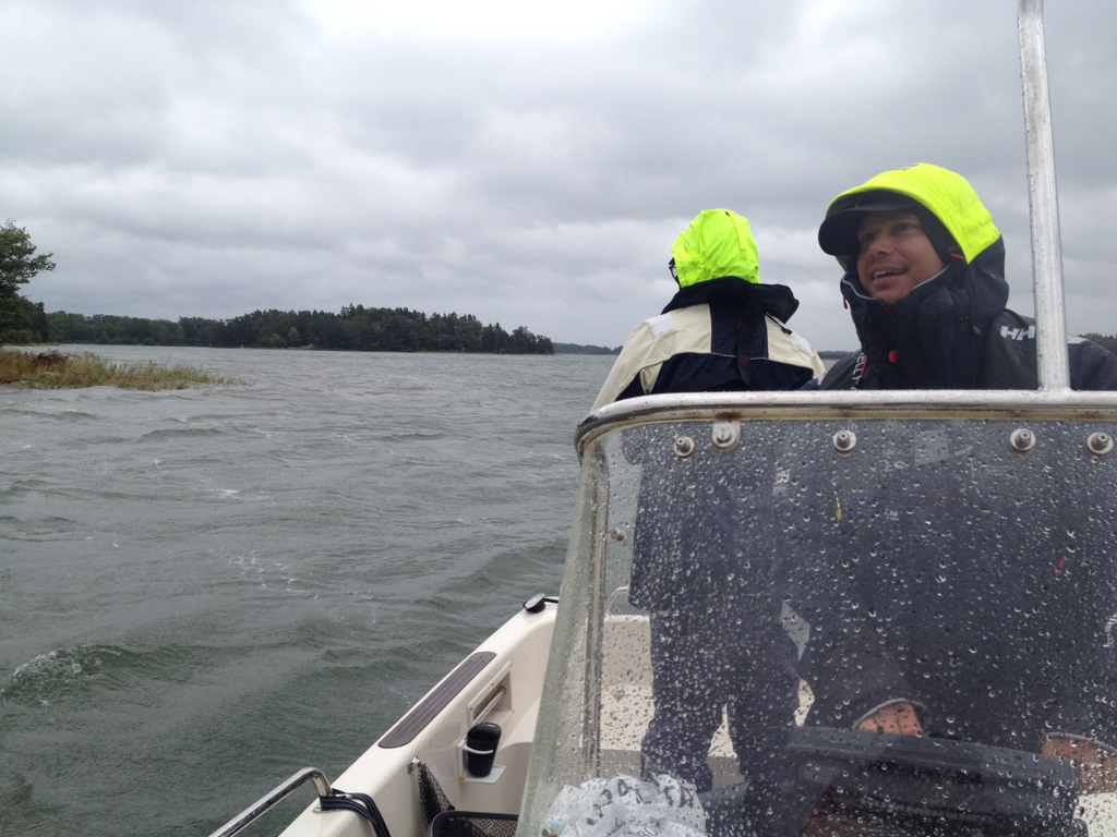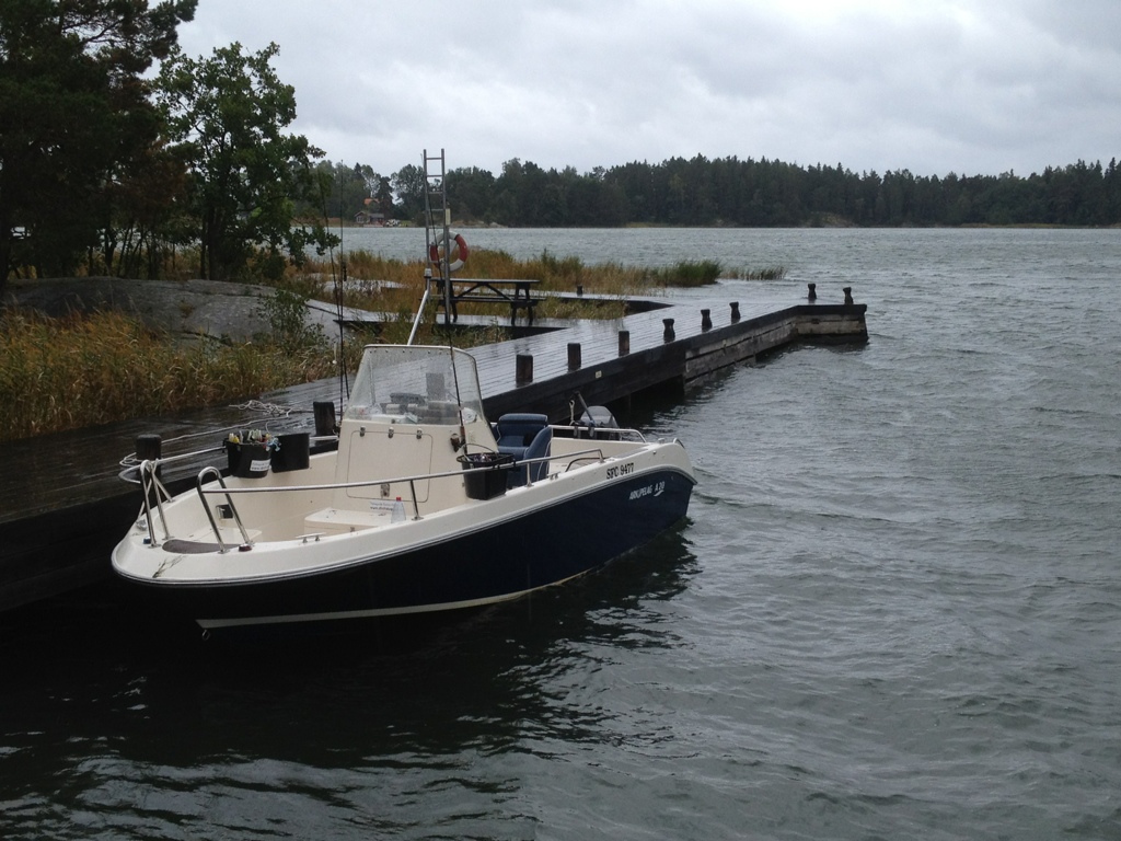 Linus hämtades först, sen blev det Johan som sa, hämta mig 04:45 för jag måste hinna till bageriet innan. 😀 Sen körde vi ut mot Värmdö med båten, en BusterBig. Riktigt fin, dock har åldern tagit ut sin rät och hela pulpeten sitter löst. Hehe, så på vägen på Täby band vi fast pulpeten med båten så den inte skulle studsa/flyga av.