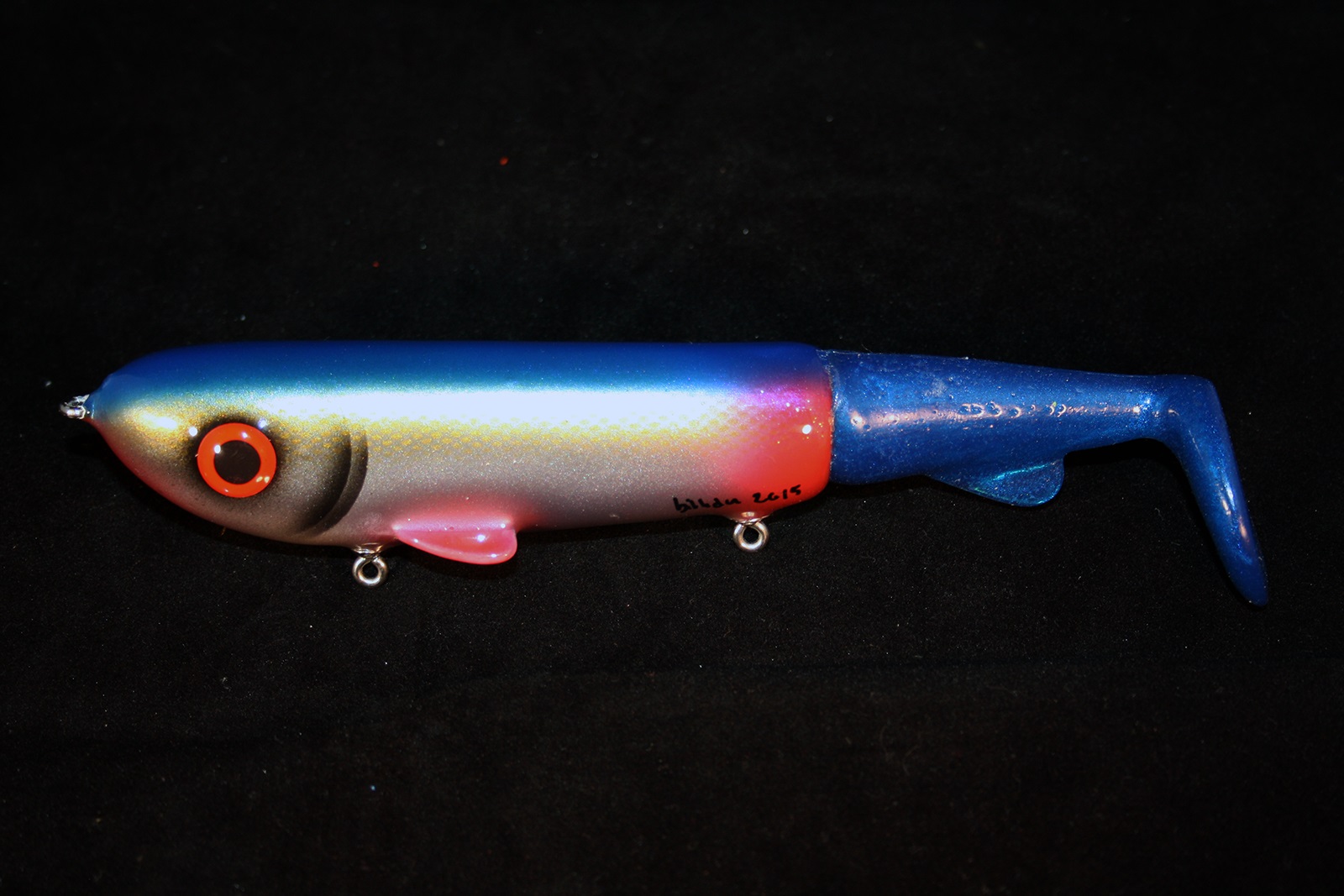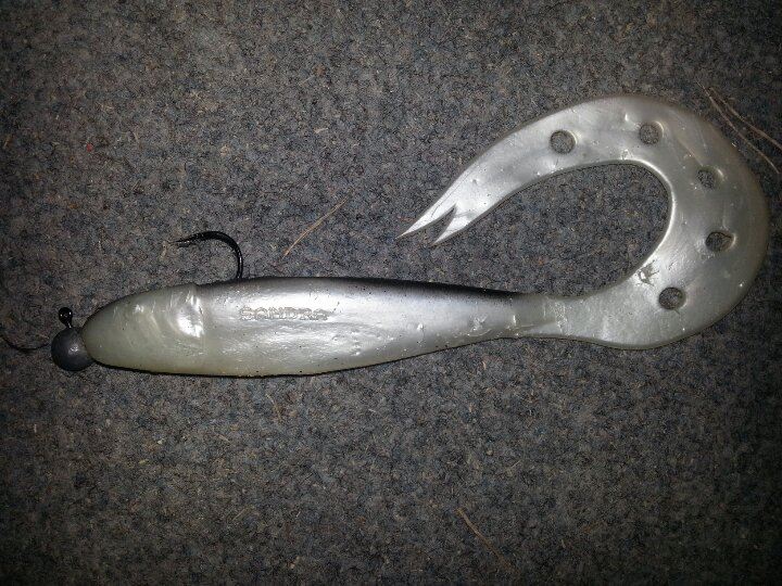 De var när ja börja fiska me mina egna beten som ja börja få stor fisk!!o de va just den här färgen (borren) som ja kallar den som gav mej fem fiskar över den magiska gränsen 10kg tror de kom upp många fina fiskar även från andra på betena därför man fortsatte!! Ca 80 g me tail e slow sink ett väldigt lätt kastat samt fiskat bete!! Kan twitcha till den o den ställer sig på sidan brukar va het när dom e lite sega. Samt att de går o få en viss gång på betet när man rycker hem den.