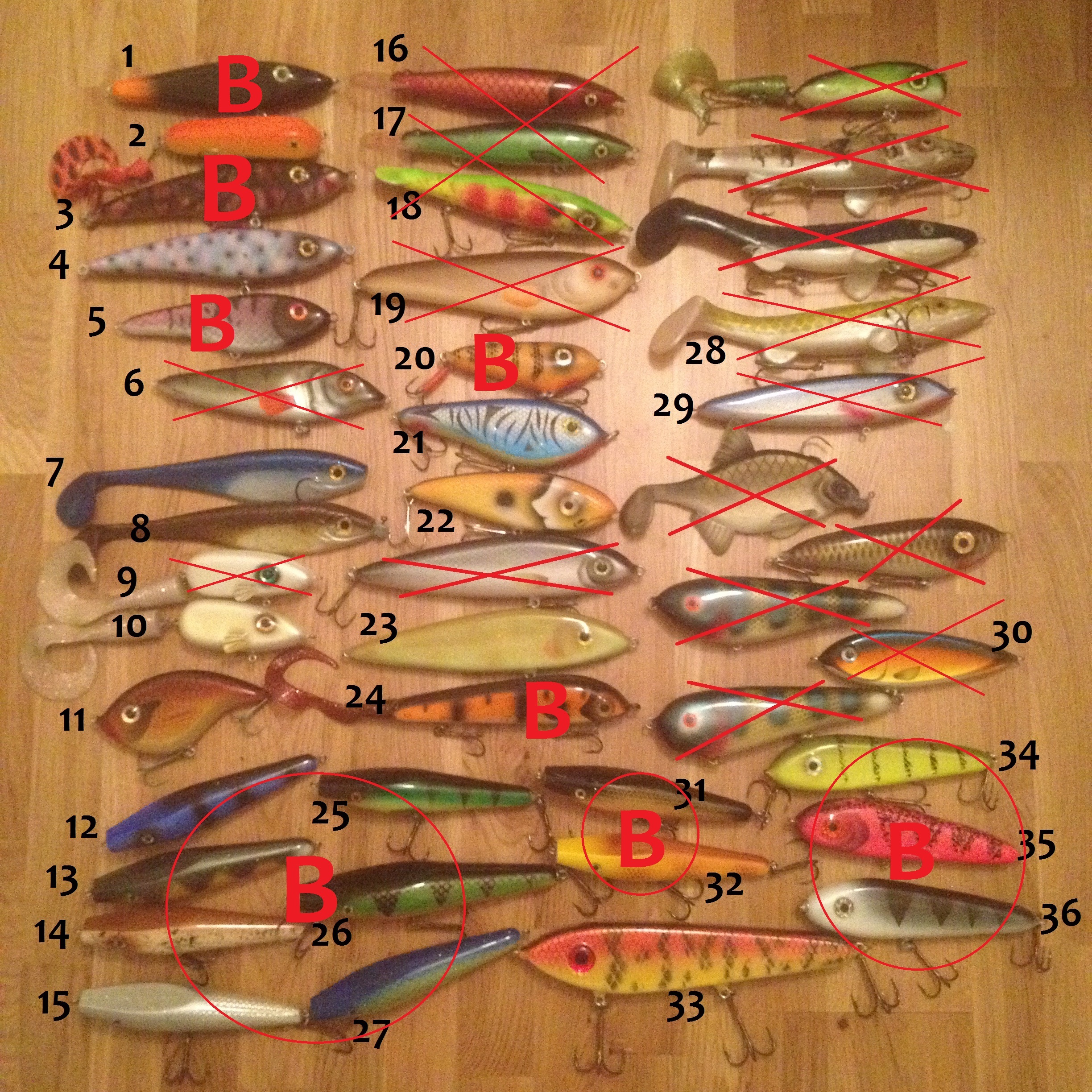 8.Boggs 9-10.BogsShad 11.SöderCurly 12. Oklart, Jiggen från Jiggar.nu? 13. JW-Tail, trä med bigtail från Svartzonker