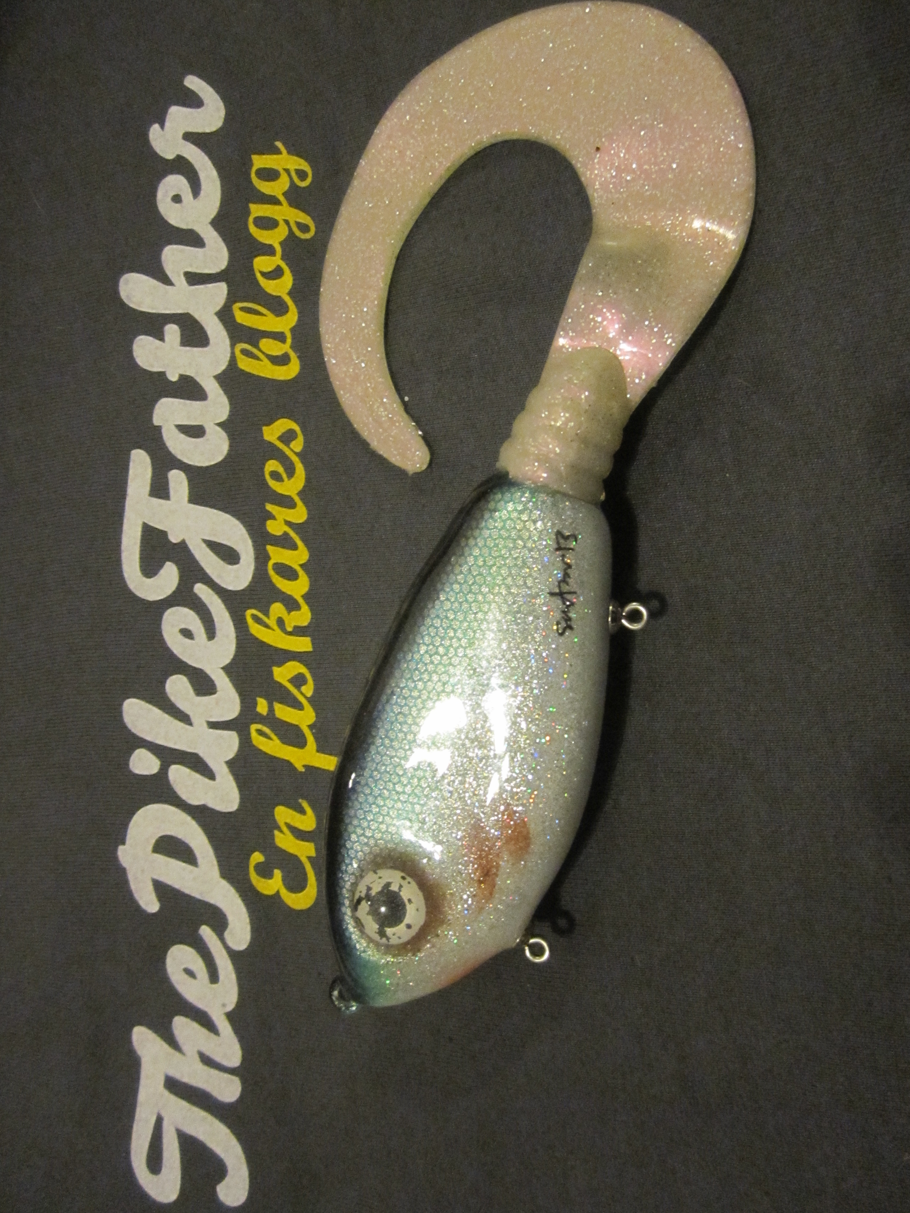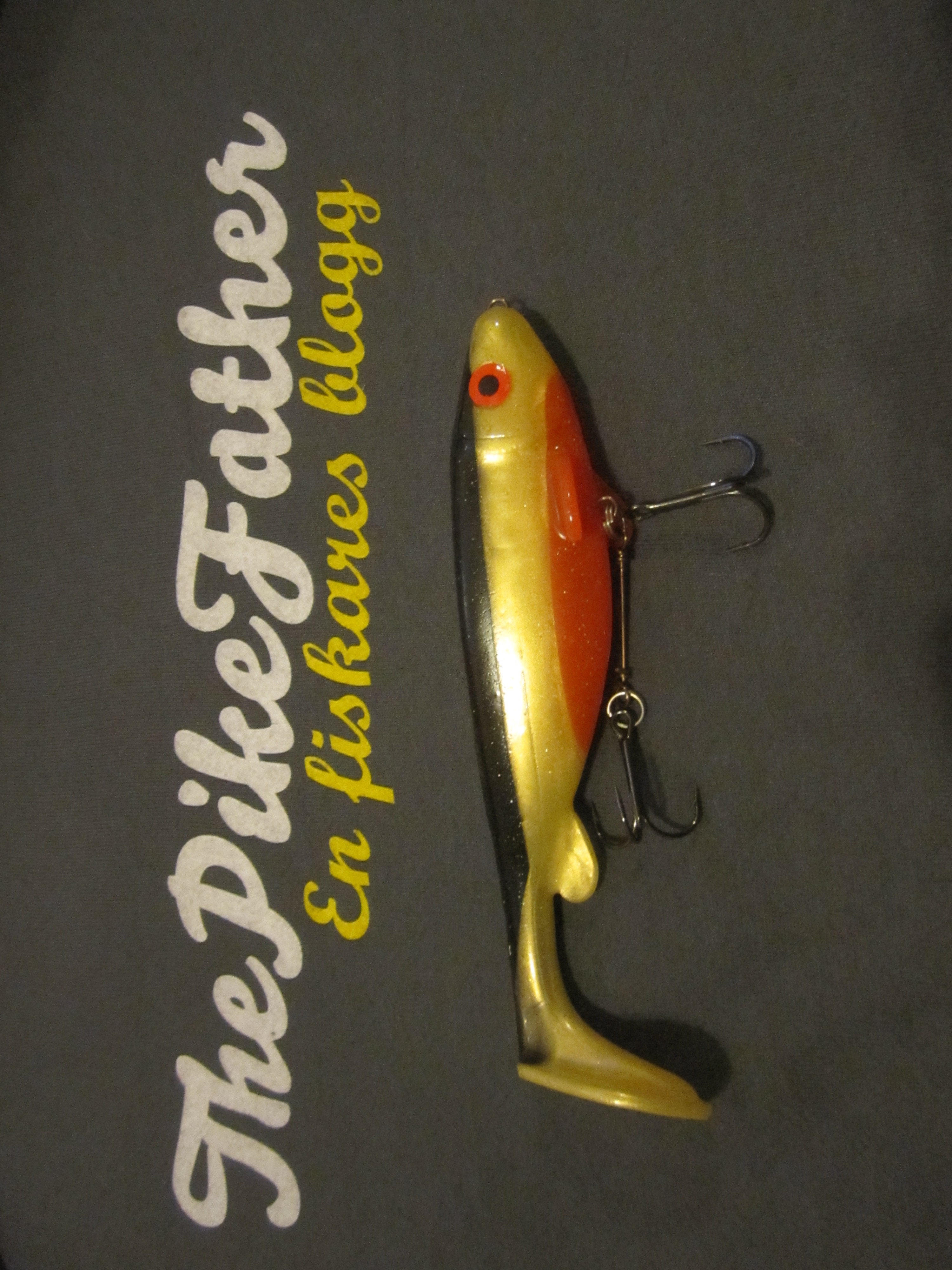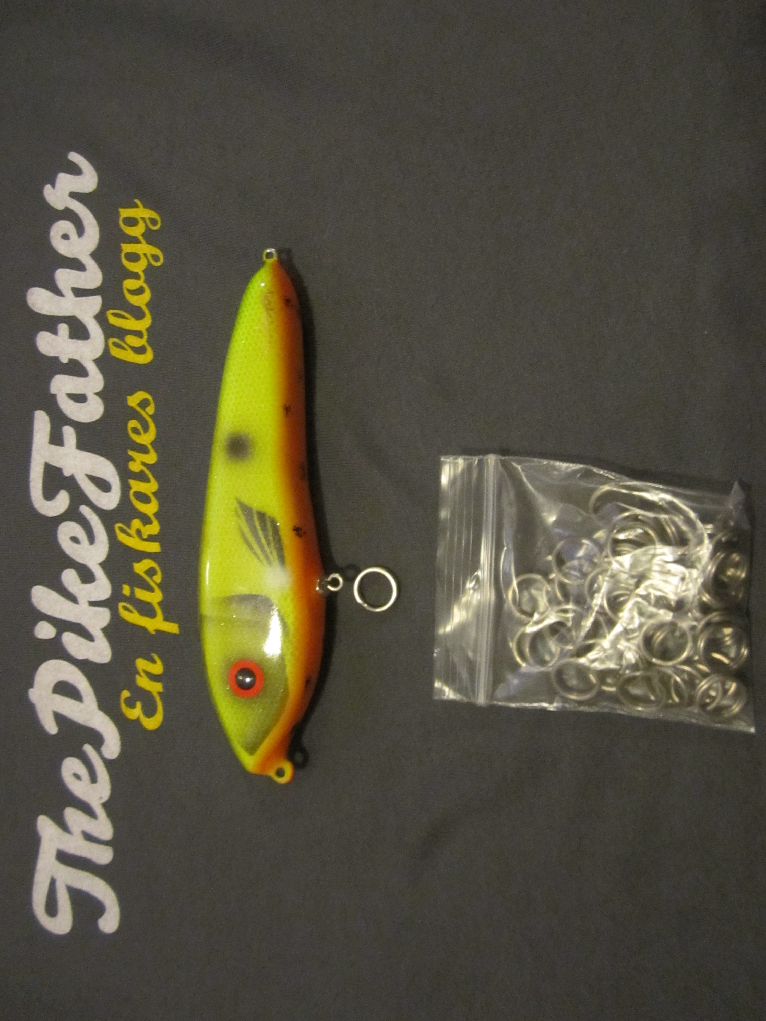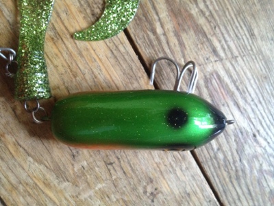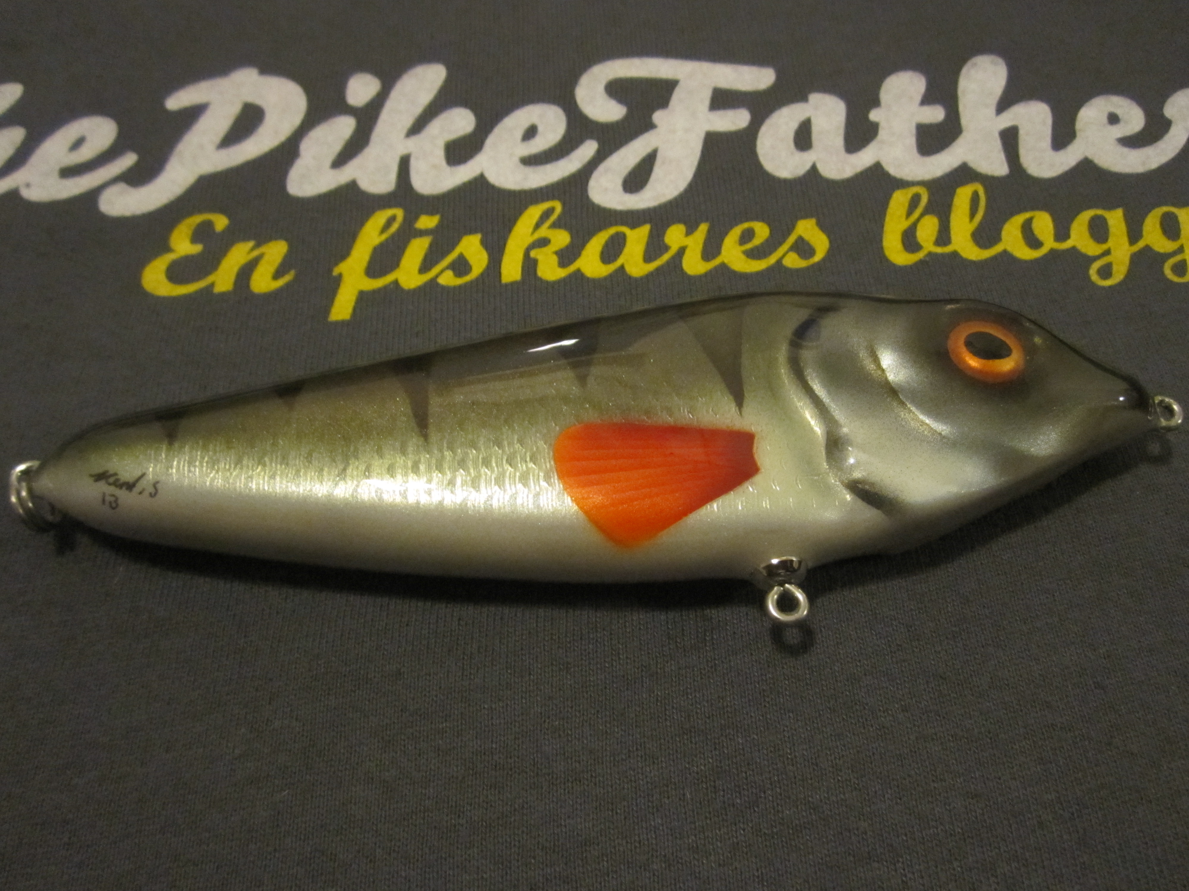 Mitt första jerkbait. Gick väldigt fint i vattnet, såg ut som skräp. Jag fick en gädda, sen pensionerade jag betet. 😀