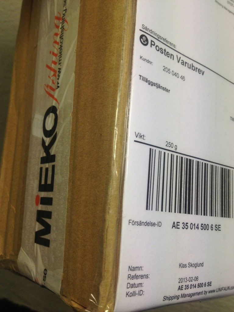 Jaja, nog om det. Jag gick från busshållplatsen med mina Sorelkängor mot hemmet och första anhalt brevlådan. Beredd på räkningar och reklam som alltid. O visst var det tråkpost och reklam, men sen var det lite som när folk öppnar paket i filmer, lager efter lager av paketpapper öppnades (läs räkningar) och längst ner i lådan i ficklampans sken ett paket. Miekotejpen skvallrade om finpaket! Nu kändes det plötsligt lite skoj att komma hem.