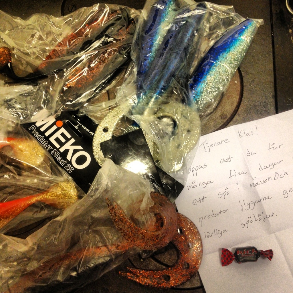 Tog av mig ytterkläder, mössa och skor. Det är något speciellt när man ska öppna finpaket eller finpost. Man vill, eller iaf jag vill vara 100% där, närvarande. Klippiklipp med saxen, och i paketet ett gäng med jig alá Predator Tail och Predator Shad.