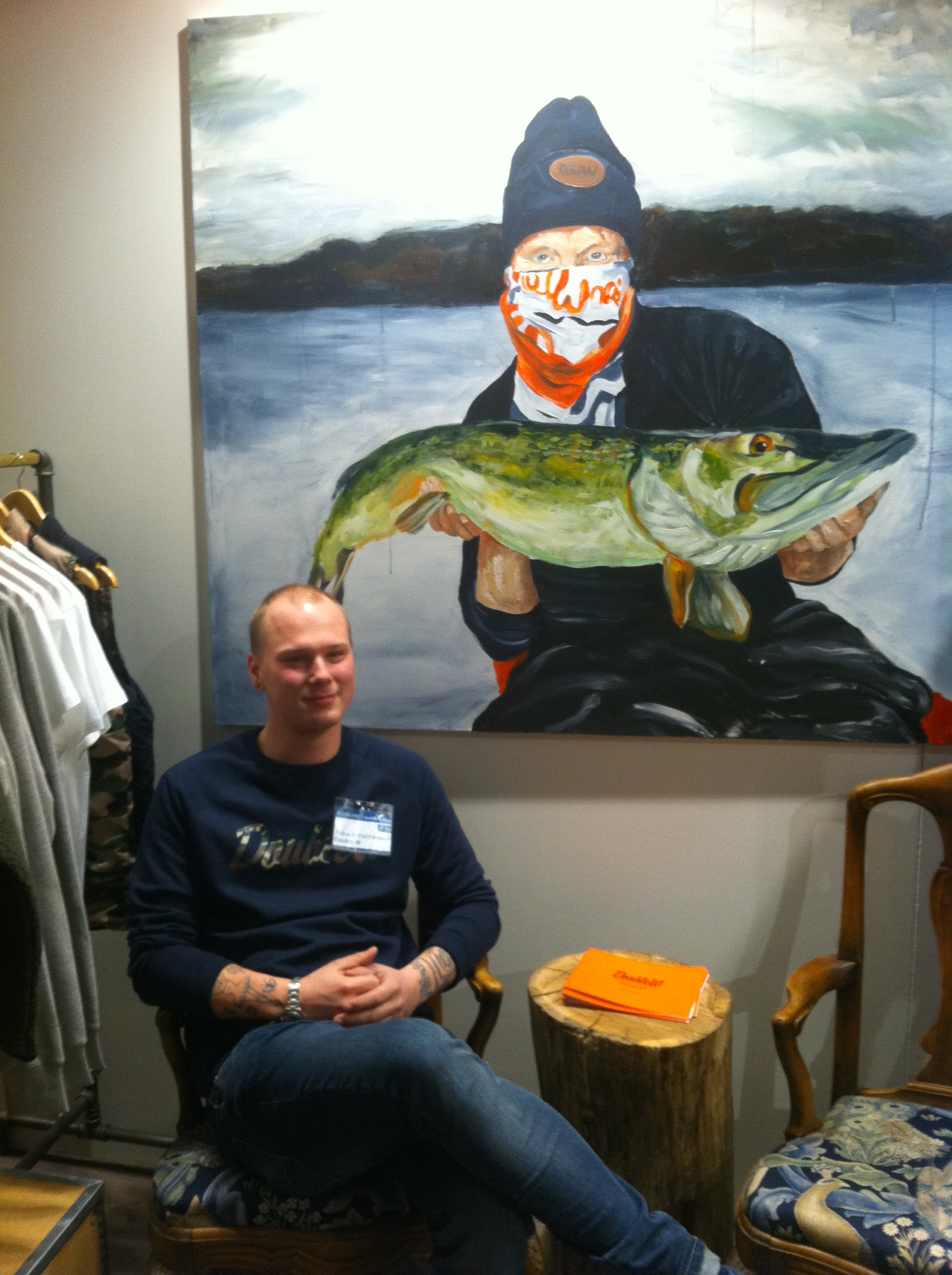 Mina damer och herrar. Bobo är en man med många järn i elden! En riktig konstnär, tavlorna i montern är hans egna verk, kläderna är ritade av honom. Beundransvärt. Fantastiskt fin tavla Bobo. Så häftigt du målat motiv med dina kläder inmålat. Sen med gädda som grädde på moset! Toppen!