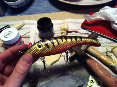 En helt fantastisk dag på sjön, så skoj att fiska med egna beten. Det vi lärt oss idag är för mig att sprayburksfärg tillsammans med sprayburkslack inte är det bästa, snarare tvärtom. Fick lacksläp direkt på ytbetet, och jerkbaitet skavdes av krokarna nästan direkt. Så torkhjul blir det så man kan epoxylacka betena inom en snar framtid, eller med LV1-lack som inte absolut behöver torkhjul.