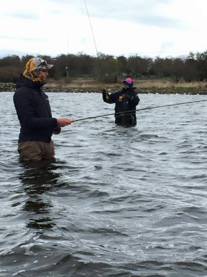 Jag hade som en ramsa där jag vaggade kroppen i takt och sa lite för mig själv, VomVom, Vom – Vom, Vom  – Vom… osså längre och längre mellan vomvom-ljuden i takt med att linan kom ut mer och mer. Stålhammar m.fl hade rätt skoj åt mig när jag stod och lät i vattnet. Men det bjuder jag på. Dag 3 kändes det mer naturligt, jag slapp tänka konstant “hur var det nu, finger här, lina där, först snabbt sen långsammare” osv. Kändes mer som det kom naturligt, den kraft som kastet faktiskt behöver kom naturligt och på de ställen i spöt som efterfrågar kraft och vid rätta tidpunkter. Svårt att förklara, lättare när man faktiskt står med ett spö i handen.