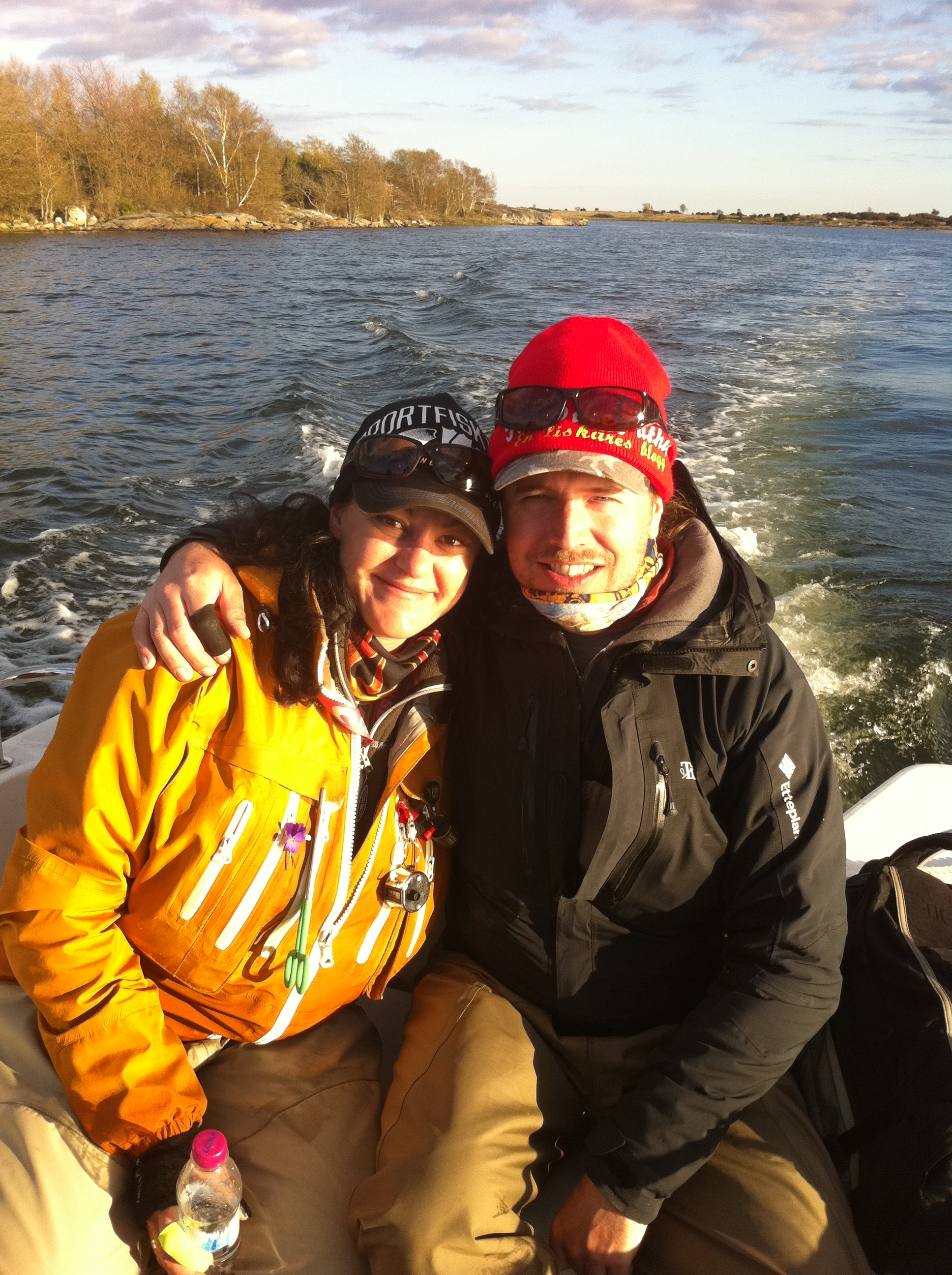 Men först var det byte av kläder på Sandhamn Marina, fick låna ombyteslokaler av Ulf, Peter och Mattis som alla driver eller arbetar där. Av åkte jeans, linne och skjorta och ersattes av lite underställ, lager på lagerkläder, och de fina grejer vi fått låna, buff, vadare, flugfiskedojjor, keps och TPF-mössa. Allt satt som en smeck!