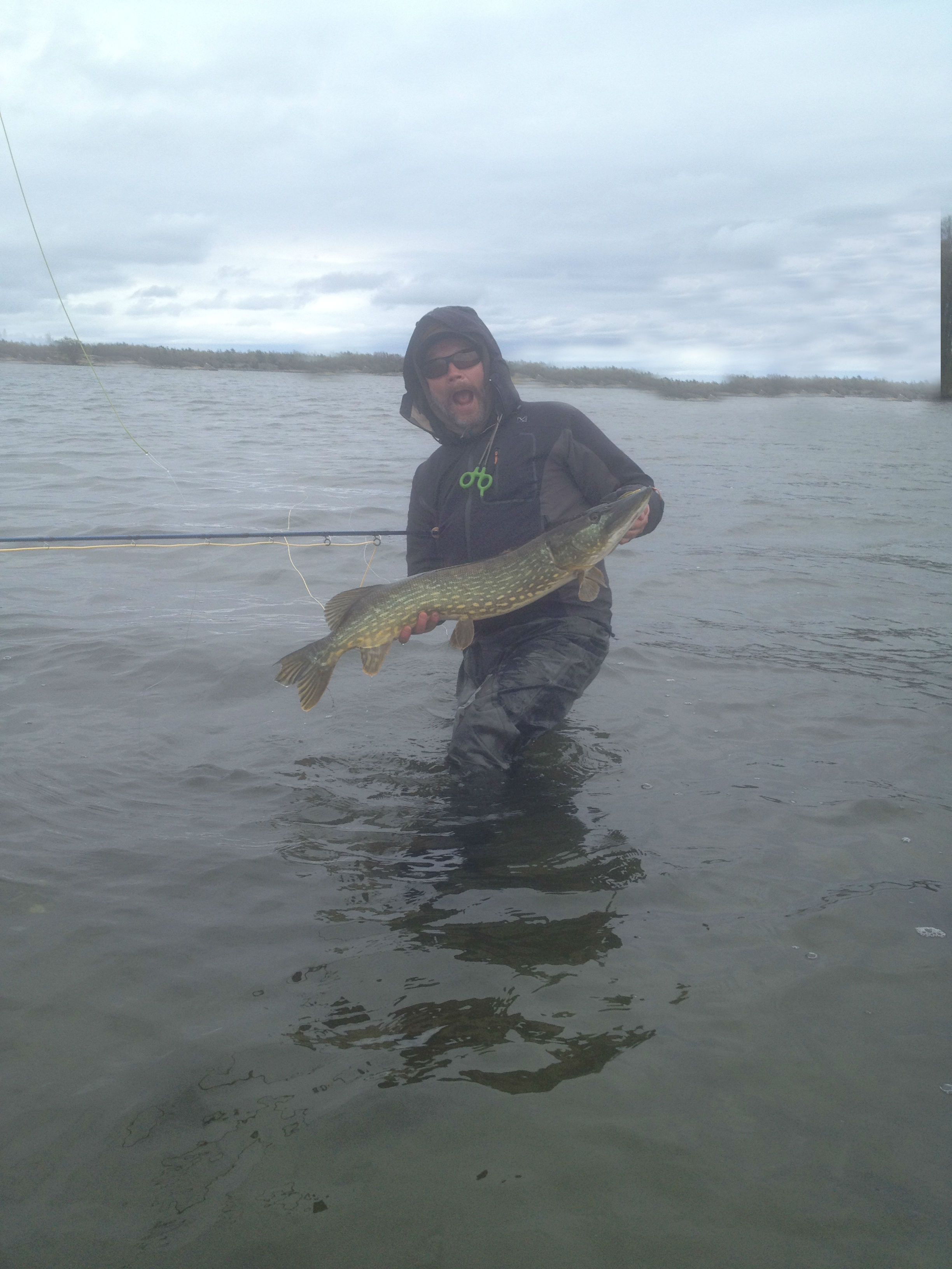Första dagen fick jag ingen fisk alls. Inte ens ett hugg, men det kanske var av ovan angiven anledning. Mitt i allt flugfiskekaos för mig ropar MJF till, “-Fiiiiiiiisk”. En fin gädda, Mattias premiärgädda på flugfiske får sig några andetag frisk luft. MJF´s första flugfiskade gädda är ett faktum. Sjukt skoj! Mattias fick sig ett par till gäddor under dagen. Faktum är att alla närvarande utom jag fick fisk. 😀