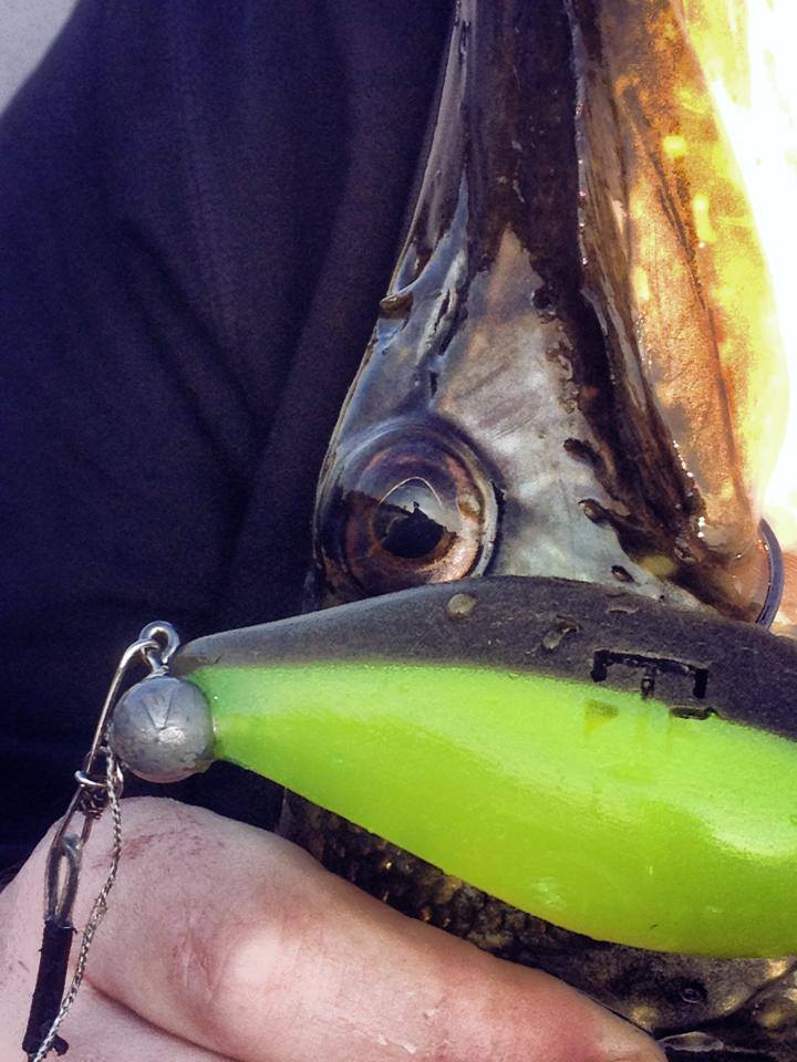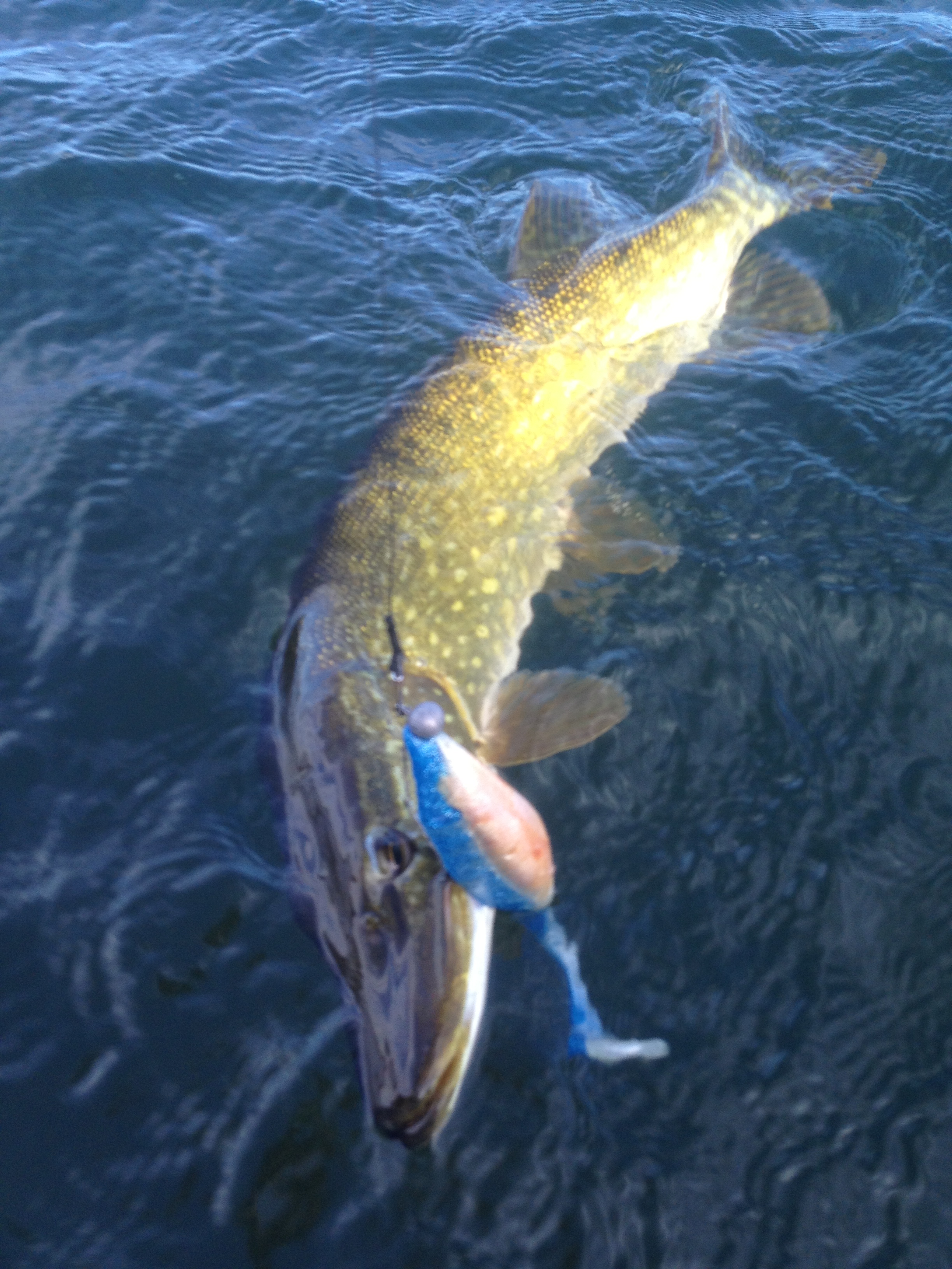 Första fisken jag fick på min TPF-jig. 8,7. Tredje kastet, *smaaaacka*. 🙂