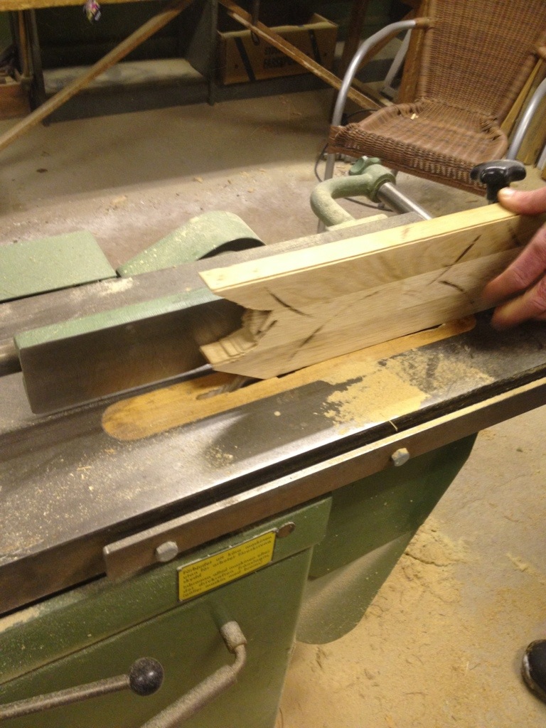 Började hos min morbror som har en bra snickarverkstad. Fick hjälp att såga med klinga för att minska tjockleken på min ekskiva.