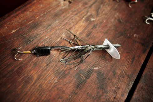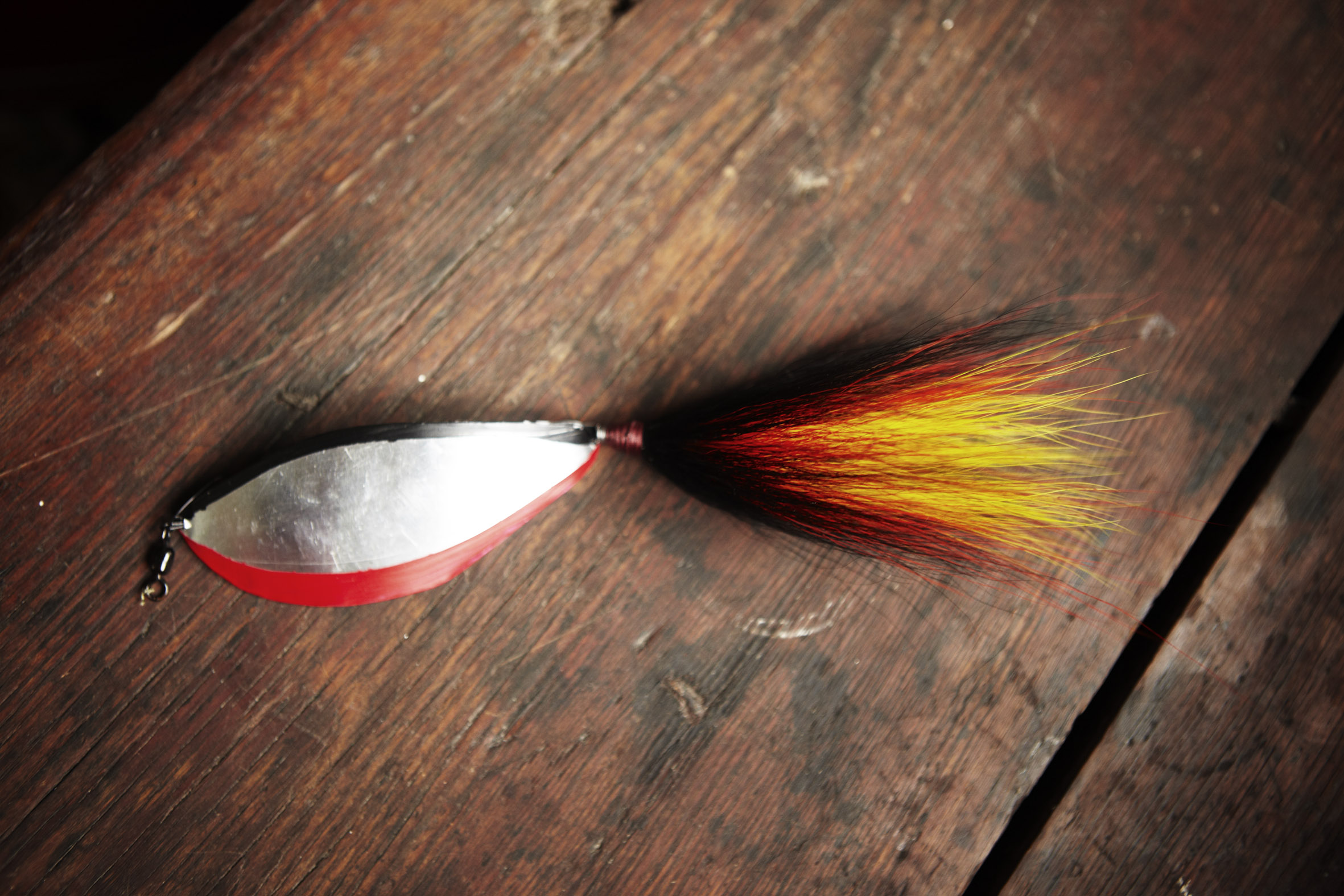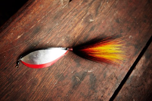 Här är Lunkans skeddrag, ett riktigt konstverk! Gjord i lättviktig aluminium, med en lekmans genomgående wire på baksidan. (Återigen, vi lär oss.) Viktningen var för gårdagens fiske kanske aningens lätt. Gick precis i ytan, inget fel i det, andra dagar passar det perfekt. Utseendemässigt var denna en killer. Fick nästan lite ångest över min enkla konstruktion på mitt skeddrag när man ser denna. Bucktailen är från Lundgrens. Detta bete tror jag stenhårt på i grunda vikar när man vet gäddan står grunt, eller att man sätter på mer vikter på baksidan. Kan vara svår att hålla hel efter gäddans käftar bitit denna ett par gånger. Men framtiden får utvisa detta. 😀