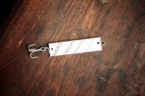 Mitt tävlande skeddrag som drog upp två gäddor. Fick en liten metallbit av jobbet, som hör till skiljeväggar. Borrade hål aningens dragna åt ena hållet. Hade en fin gungande gång. Reflextejp virad runt kroppen. Sjukt fult, men levererade. 🙂 Sjunker som ett lättare traditionellt skeddrag.