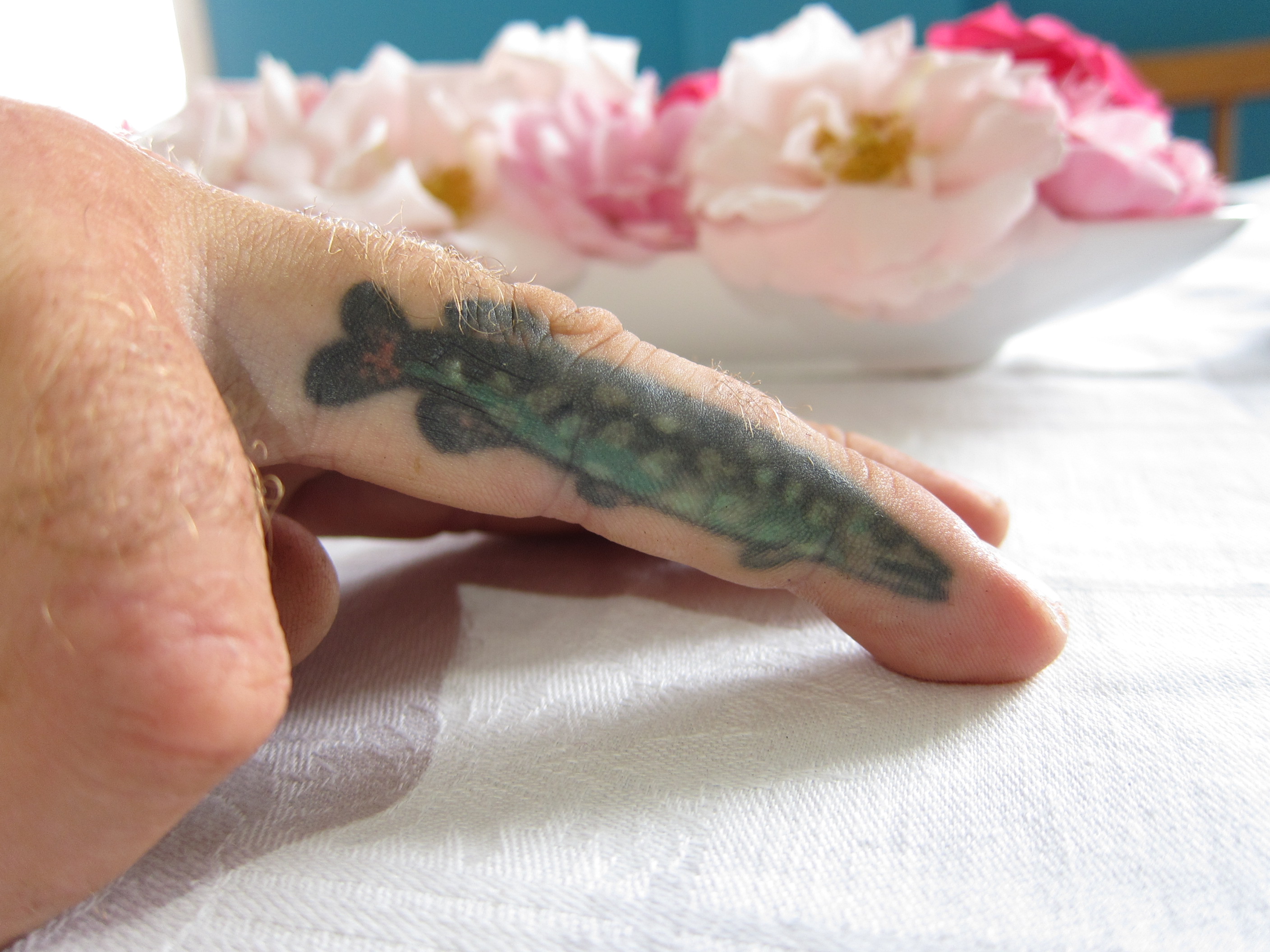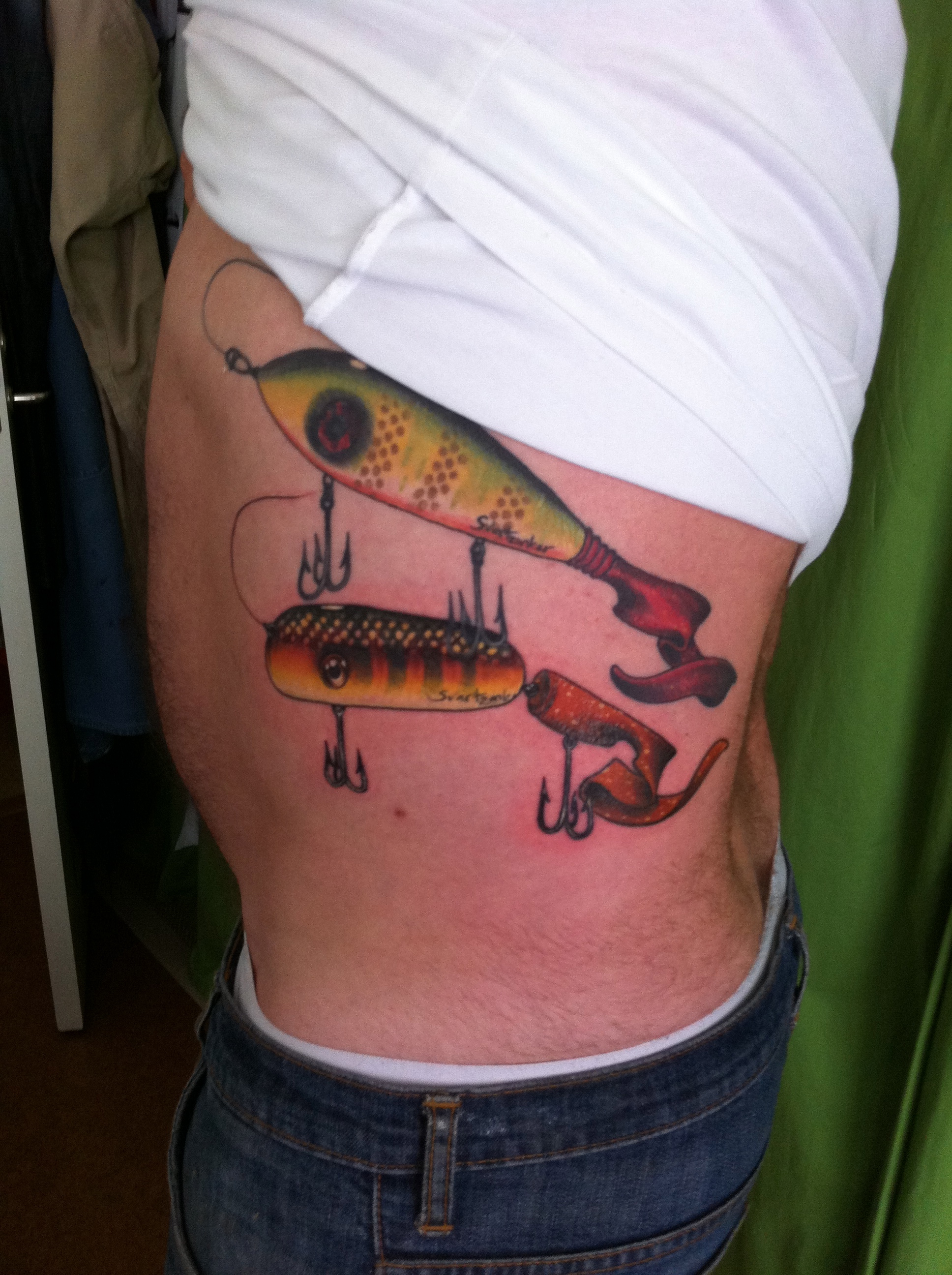 -Hur många tatueringar har du med gäddanknutning? 4 st. Ruggigt fina, sen att ha sina egna beten på kroppen toppar det hela en smula!