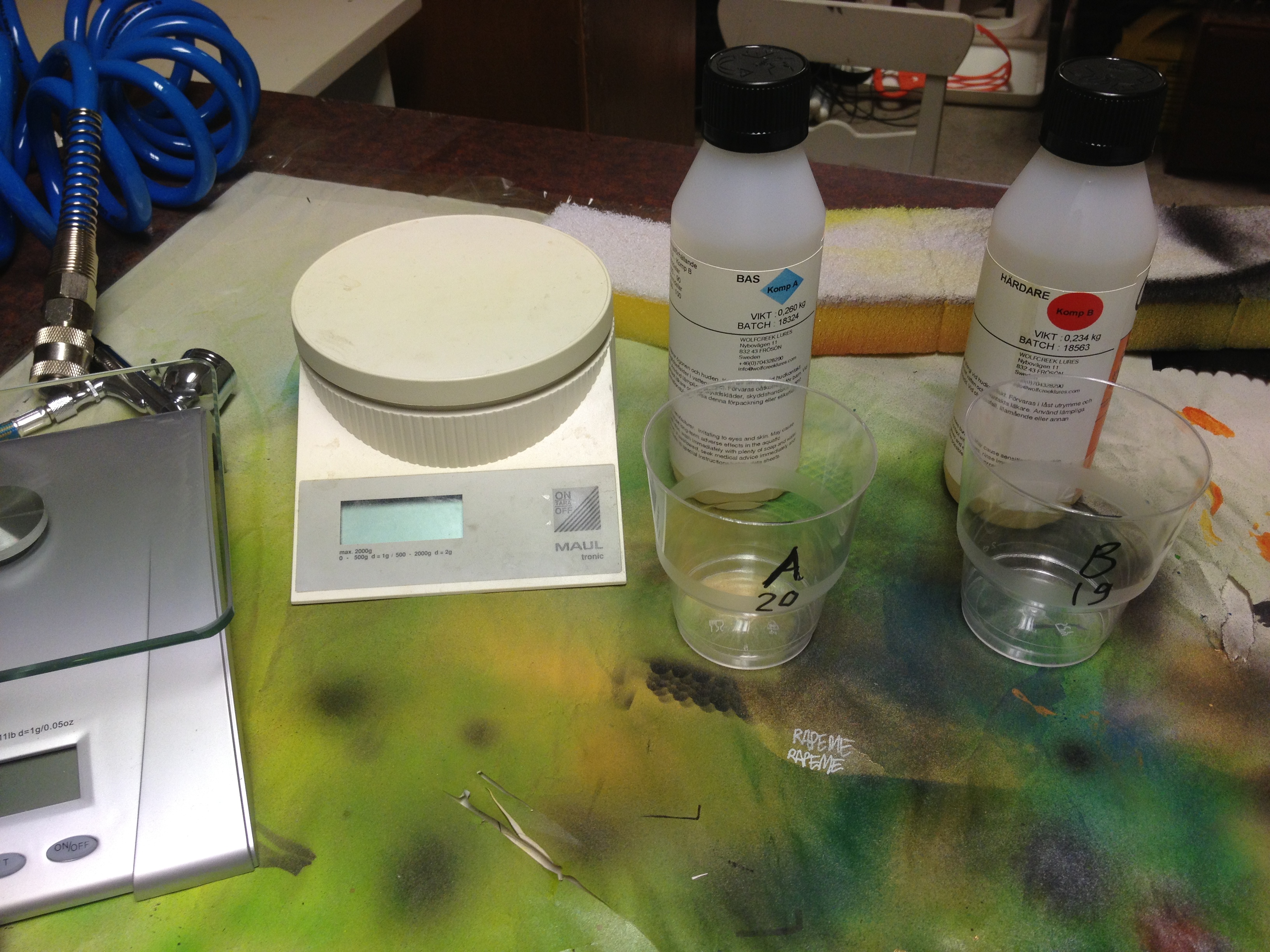 -Vilken epoxy använder du till lack? C&W. Fick låna en bild av mig själv. Men C&W likväl. Vi kan väl utgå ifrån att Clabsters förpackningar är aningens större?! 🙂
