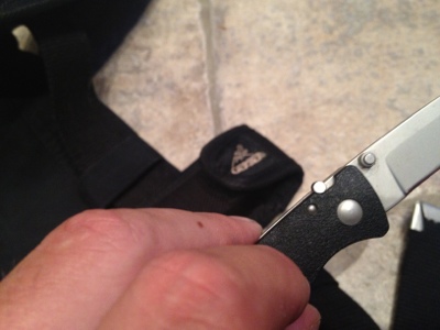 Öppningsfunktion när man vill fälla ihop kniven. Metallskenan i mitten av handtaget som går diagonalt över handtaget trycks in, sen kan man fälla ihop den.