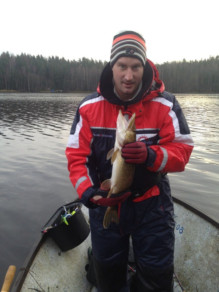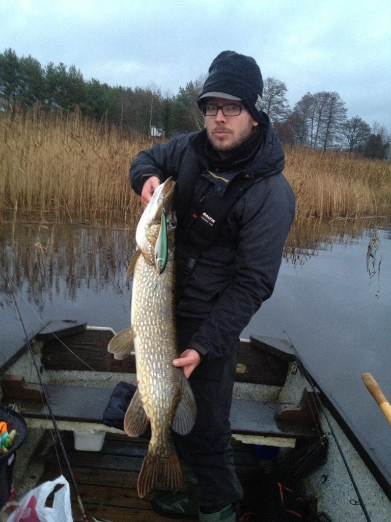 Hur som haver, vi nöter längs den sista vassen för dagen. Togge har en gädda som envisas med att anfalla med stängd mun, vevstopp “hugg” med stängd mun. Togge säger det är något litet. Jag slänger åt andra hållet mot vassen. Plask, betet landar, jag tar ett jerksvep med min BigBandit. *Smacka* känner direkt det är en fin gädda. Blir lite kamp, gäddan kränger och snörrar. Krokningen från munnen som såg stabil ut blir istället sådär, när jag ser att gäddan krokat om sig och den ena trekroken sitter på gäddans ansikte på utsidan. Snabbt gälgrepp, upp i båten, sån tur är sitter krokningen rätt ytligt. Jag hade lite tur att jag inte missade denna gädda. Blev snabb fotografering och vägning. Ville enbart få tillbaka gäddan i vattnet så snabbt som möjligt så glömde mäta, men runt en meter var den allt. Behövde inte göra ngt med gäddan i vattnet, den drog direkt med en fin stjärtfeneskvätt ut över oss i båten. 🙂 6,40kg visade vågen på. Haft riktigt bra fiske senaste veckorna, med många fina gäddor.
