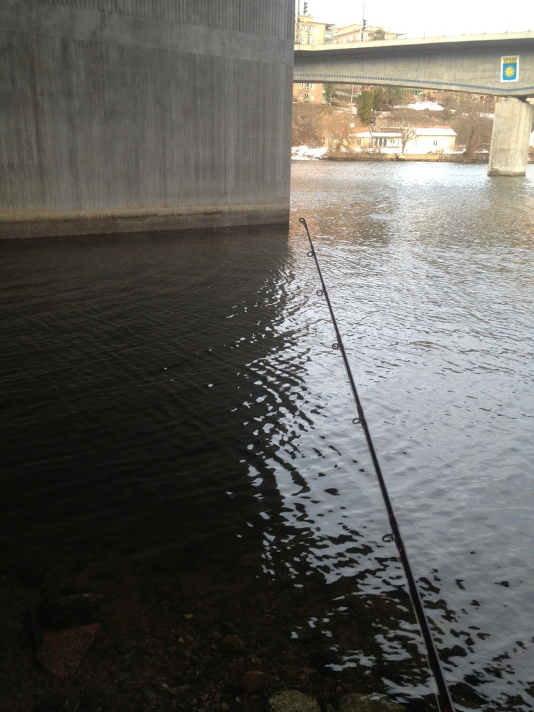 Hur som haver, då jag slutade tidigare, och solen var framme kändes det som att provfiske av mina handgjorda beten skulle vara på sin plats. Micke (CaesarLures) hade skvallrat om ett brofundament som hade isfritt. Hem och packa väskan, i med enbart mina egna beten och i säkert 50 knyck, förde jag fram min gäddnattsvarta v70 till slutdestinationen.