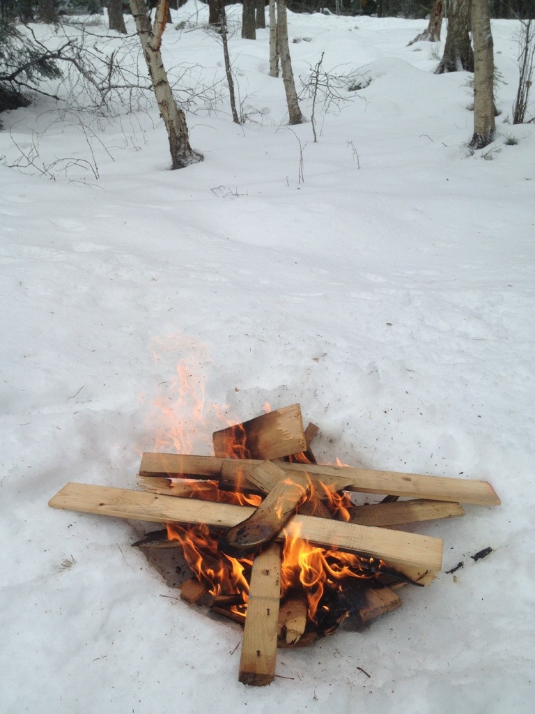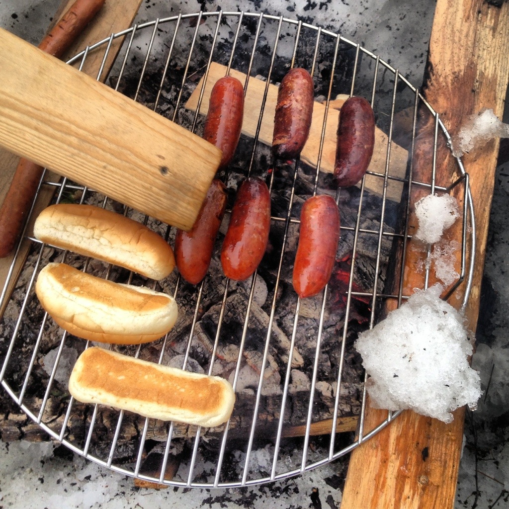 Grilla korv var det som stod på schemat, så efter husesyn så fixade Micke ved och jag lekte rutschelkana med hans minsting. Micke körde hardcoregrillning med spillvirke från tidigare byggen. Spillvirke gör nytta.