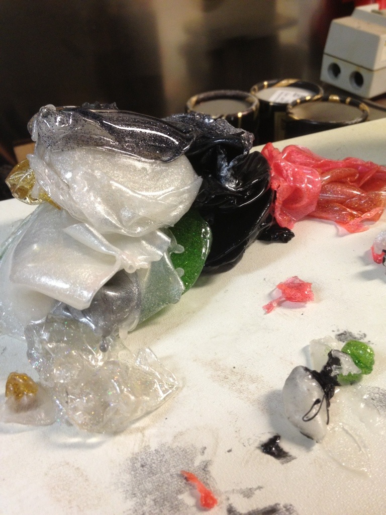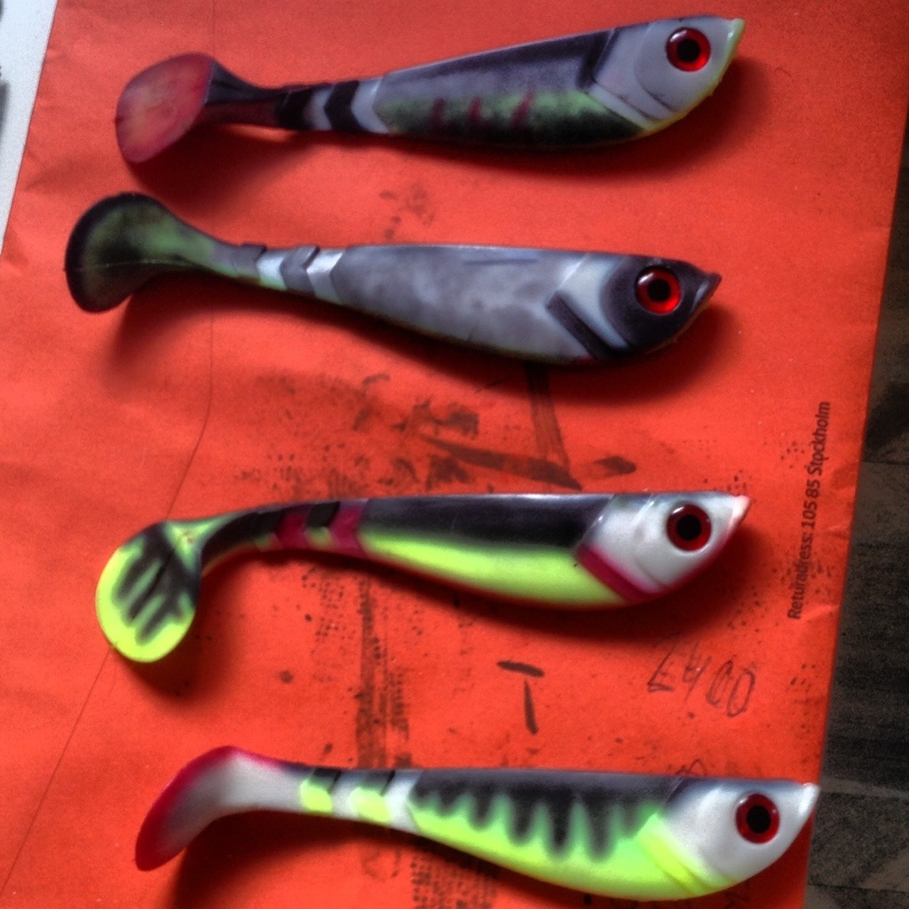Ritade endel vita jigar här för någon/några veckor sedan. Här är resultatet, dessa pennor förenas mer med betet än man tror. De som ni ser som svarta/grå i kroppen hade jag gjort “fjällade”, men som synes färgen “rinner” ut rätt mycket. Men helt klart skoj att göra, och man kan piffa till sina jigar vid behov.