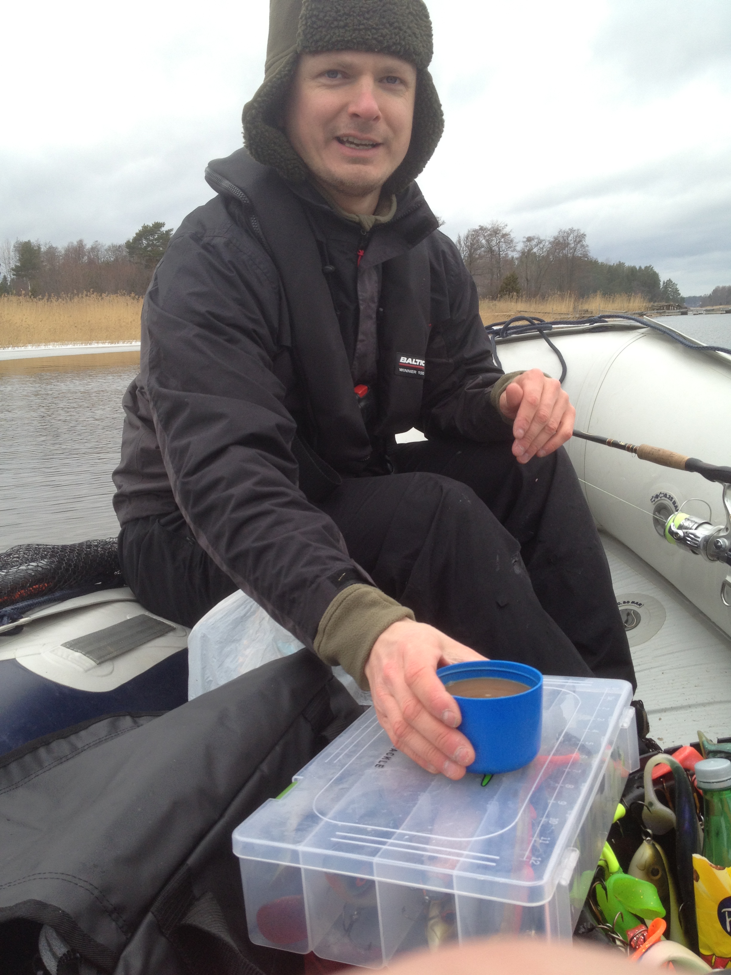 Söndag, sov till säkert 10, tog en promenad, kollade lite film, riktigt fint vårväder med sol och grejer, men baske mig… kallt som i frysen typ. Packade en ny fiskeväska med lite hemmagjort, och annats smått och gott som uppskattar kallt vatten. Dagens skulle bjuda på lite vinterfiske fast i öppet vatten. Ålkistan var det ngn som gissade på Instagram på någon bild jag la upp. Inte säker, men tror baske mig det stod så på någon skylt. Bockholmen kan det också ha hetat, jag och namn är ingen hit. Men hursom, kändes skönt att rasta kastarmen lite. Strömt vatten, så att fiska jerkbait gick sådär. Betena bara åkte iväg. Blev en rätt kort tur, återigen med den där Micke som jag kanske nämnt tidigare. 😀 Micke rastar kastarmen.