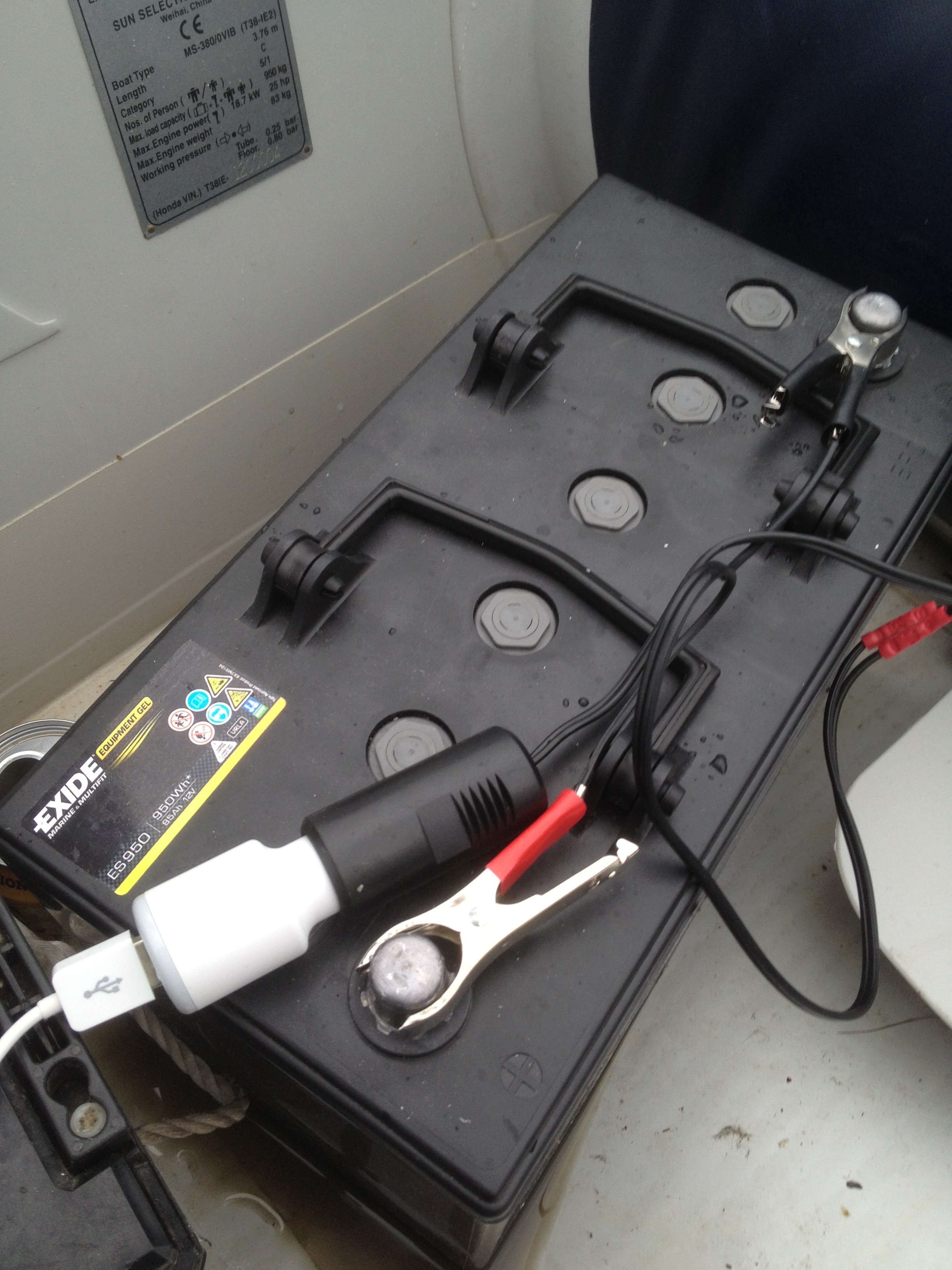 Jag och Roger hade med oss varsitt batteri. Roger slog på stort och köpte gelbatteri. Det hade vi som mobilladdarbatteri. Världens kanske bästa uppfinning, batterimobilladdare. I love it!