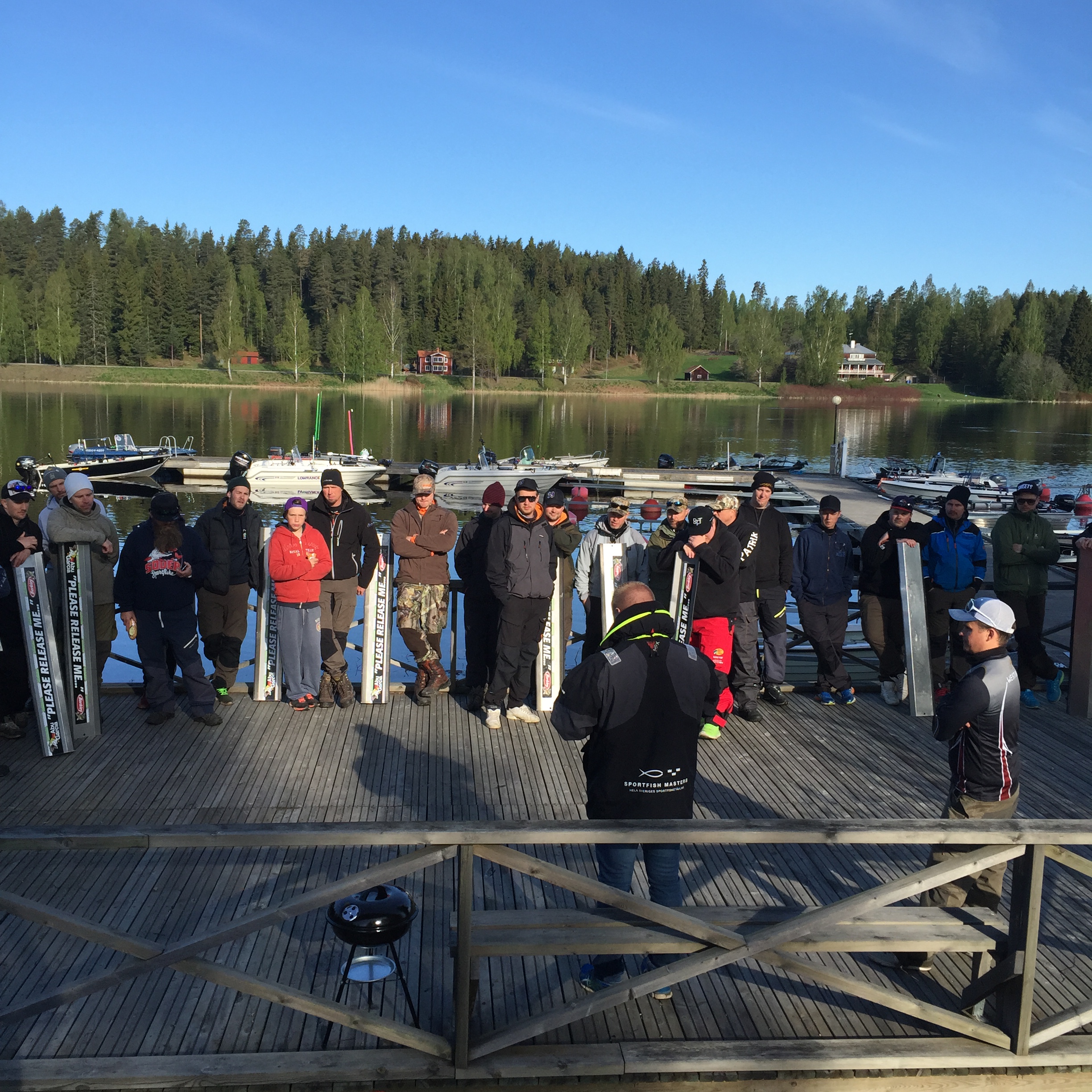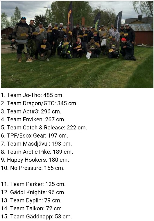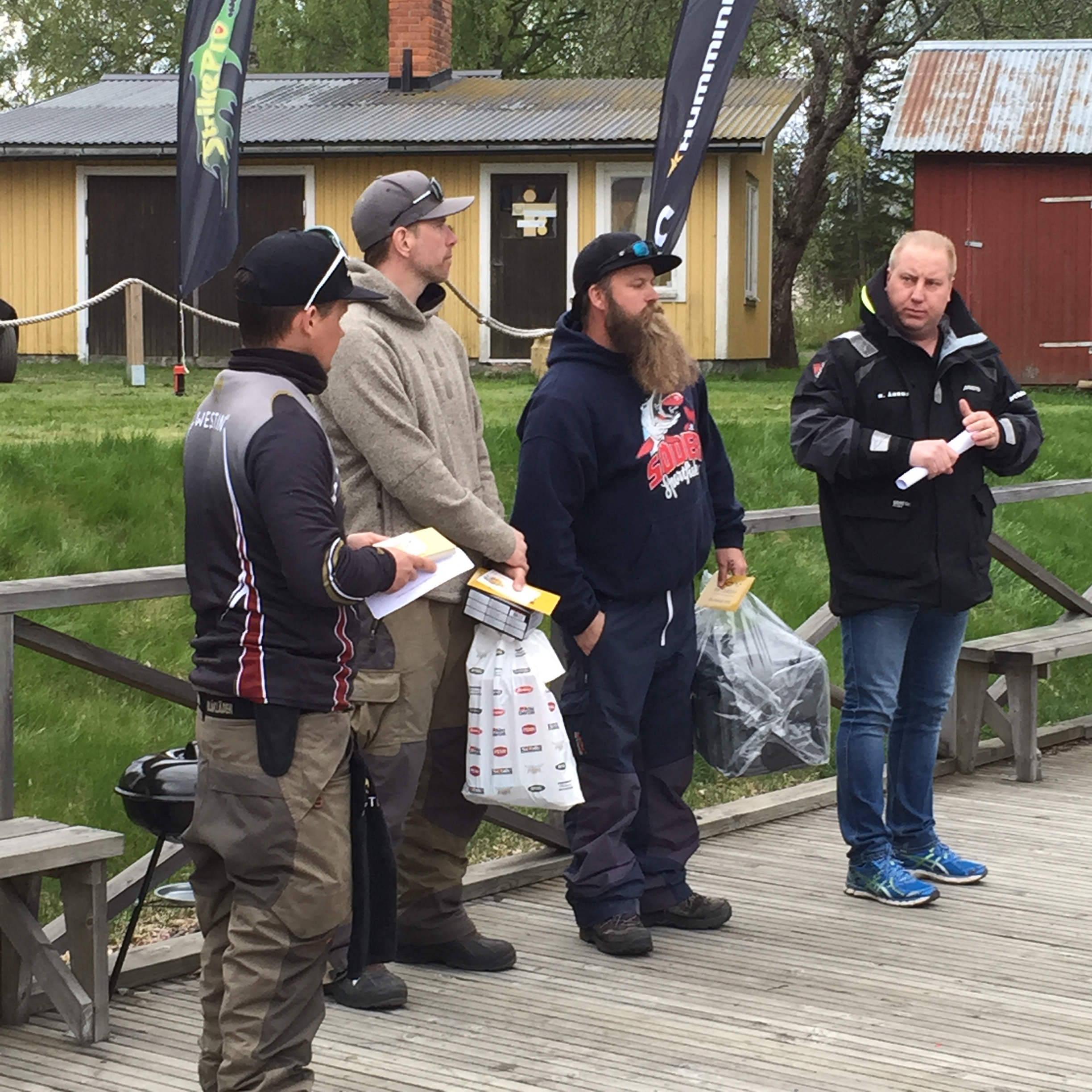 Andreas polare AC drog hem för dagen, och Andreas kom över i vår båt istället. Tre fiskare i båten och vi har fortfarande gott om plats. En drömbåt, en vacker dag när jag har plats för båt vid mitt boende ska jag också ha en rymlig och bra fiskebåt. Andreas Jax, Steve och jag har rätt samma syn på fisket. Vi nöter om det behövs, vi fiskar under skratt och har skoj! Inge tjafs alls. Hela dagen kändes som vi fiskade ställen som alla tre var överens om såg bra ut, och tilltalade oss. Så skönt! Jag bytte om till nya Boon Shad, bland de första kasten jag gör, säg 5:e kastet så smackade det på! Ni vet, ibland känner man direkt att det är något bättre som kliver på. Iof kan det ibland vara Braxen, eller någon fisk som blivit felkrokad och känslan av stor fisk visar sig vara felaktig. Men här är det drillning som känns i spöt, huvudgung, och arg gädda. Adrenalin, haha! Ja, när jag landat fisken och Steve håvat säger Jaxen: “- Det syns att du fått adrenalinpåslag, dina händer darrar.”. Tror precis det som herr Jax påtalade är mycket det fisket handlar om. Adrenalinpåslaget, spänningen. Jakten efter just det. En rätt bra pjäs. Jaxen sa: “-Det kan mycket väl vara en tia”. Sånt gör att man blir mer spänd och förväntasfull.  😀 9 Min håvade dam som föll för EsoxGear, Boon Shad. . Kroka ur krokarna i håven och upp i båten. 10 Gäddan får stöd sekunden efter på buken av min andra hand direkt hon kommit upp. . En riktig skönhet som mäter in på 113centimeter. Precis bakom gälen satt något hårt som en fisk (?) men resten av magen var som en tom påse. Bra längd med potential, någon eller några veckor senare är denna fisk lätt en tung 9:a, 10:a skulle jag tro. 11 Precis över 8kg. . 12Snabb vägning och mätning. Sen fick hon simma tillbaka. Satt bra krokad, men hon blödde en aningens, så blev toksnabb release. . 13 Jag smutsade ner lite, eller jag orsakade gäddan skada med kroken så hon smutsade ner. Ja, ni hajar. Men inget som inte lite högtryckstvätt kan få bort.  Ser makabert ut kanske. Men bra att visa att sånt kan hända också, detta är rätt lite ändå. Ibland kan man träffa som artär med krokarna, då är det värre. Bara att påskynda det som “måste” göras och släppa tillbaka så snabbt man märker gäddan blöder eller tagit skada. . Jax hade lovat alla metergäddor, eller han sa “Tror minsann vi alla får en varsin metergädda idag”. Nu hade både jag och Steve fått en varsin. Vi fiskade vidare med samma motivation och hängivenhet… 14 Jaxen krokar av mindre gädda i vattnet. . Solen tryckte sig igenom molnen och det blev som en sommardag. Vinden avtog en smula och vi sa. Kanske inte optimalt väder för storgädd….. så mycket mer än så hann vi inte säga innan Jaxen gormade om stor fisk. Dagen till ära var det iof trettielfte gången just Jaxen ropade “Stooor fiiisk”, men denna gång såg vi andra på spöt och Andreas att så faktiskt var fallet. Haha!!  Håvning, sen var tredje metergäddan ett faktum. Även denna gäddan föll för EsoxGear BoonShad. Riktigt skoj!! Alla fick en varsin. 15 108 centimeter stabil gädda i håv. Jaxen säkrar gäddan med en säker hand. . Obligatoriska posebilden.  😀 16 Mäktigt! 7,5kg-ish. . En trippel alltså. 3 x metergäddor. 17 Steve, 103cm, TPF 113cm och Jaxen 108cm. Fantastico! . Kvällen led mot sitt slut. Vet inte hur många gäddor vi totalt landade på, ett 30-tal kanske, eller aningens fler. Fick ihop 483 centimeter som topp 5 fiskar. Helt ok.   😀 Vi trailade upp båten, och insåg att livet är allt bra underbart ibland. 18b Sånna här stunder kan man leva på ett bra tag framöver. Var helt sjukt vackert. Steves båt gjorde inte bilden sämre.  🙂 . Efter den dagens fiskelycka åkte vi till boendet som Jaxen ordnat åt oss, tog med oss varsin hamburgermeny från Lappens i Hedemora och tog några öl var innan vi somnade som små lammungar. (Lammungar somnar snabbt och sover gott).  😀 . Dag 2, alltså själva tävlingsdagen med SM-kval i Gädda. Steve väckte mig med kaffe som kunde fått kaffeskeden o stå upprätt. Det var baske mig det starkaste kaffe jag smakat sedan Dackefejden. Haha!! Även om man bara kunde dricka ett par småklunkar gjorde det susen för o piggna till. Tror mina småklunkar motsvarade drygt 27 vanliga koppar kaffe.   🙂 19 Tidig morgon i Hedemora suburbs.  😀  Vackert! . Rensbo Bed & Breakfast. Grymt ställe! 20 EsoxGear doin Rensbo B&B. . Sportfish Masters anordnar varje år SM i gädda. Mannen bakom dessa skoj tävlingar som anordnas som 19 SM-kval och en final anordnas av en enda man. Niclas Åhrman heter han. En riktig hjälte i mina ögon. Som jag ser det är hela tävlingen välordnad och gemytligt trevlig. Bra information kring tävlingen, enkla regler, bra platser (de två jag varit på). Trevligt efter tävlingen och god stämning. Allt gott till dig Niclas! Du gör ett fantastiskt arbete! Niklas Åhrman Han ser visserligen väldigt bestämt ut på kortet. Men han är väldigt trevlig!  🙂 . Efter regelgenomgång en sista gång och repetition av rapporteringstelefonnummer och ledningstelefonnummer om man får problem under tävlingen blev det allvar. Sist förklarades hur mätbrädorna skulle användas och hur foton skulle tas. Sen var det bara lycka t…. skitfiske som sas. 22 Förväntansfulle fiskare, Niclas som drar reglerna och tävlingens arrangör Andreas Jax fotade strax innan tävlingen drar igång. . Var man sugen kunde man shoppa loss på SportfishMastersprylar. Köpte en svart sån mössa förra året, sjukt skön. Men den blev stulen av någon klåpare. Så verkar vara en bra investering. Köp om ni kan. Bästa var VeroLuresbetena. Dem gillar jag skarpt!!! 21 Bra grejer. . Sen var det bara o hoppa ombord, kasta loss och vänta på startskottet. 32 Fotograf: Niclas Åhrman. . Meeep-meeep, startskottet gick. Alla brassade på. Jag och Steve tog rygg p